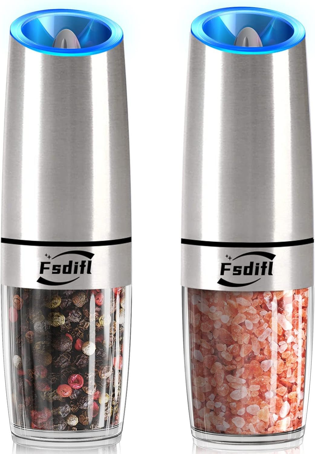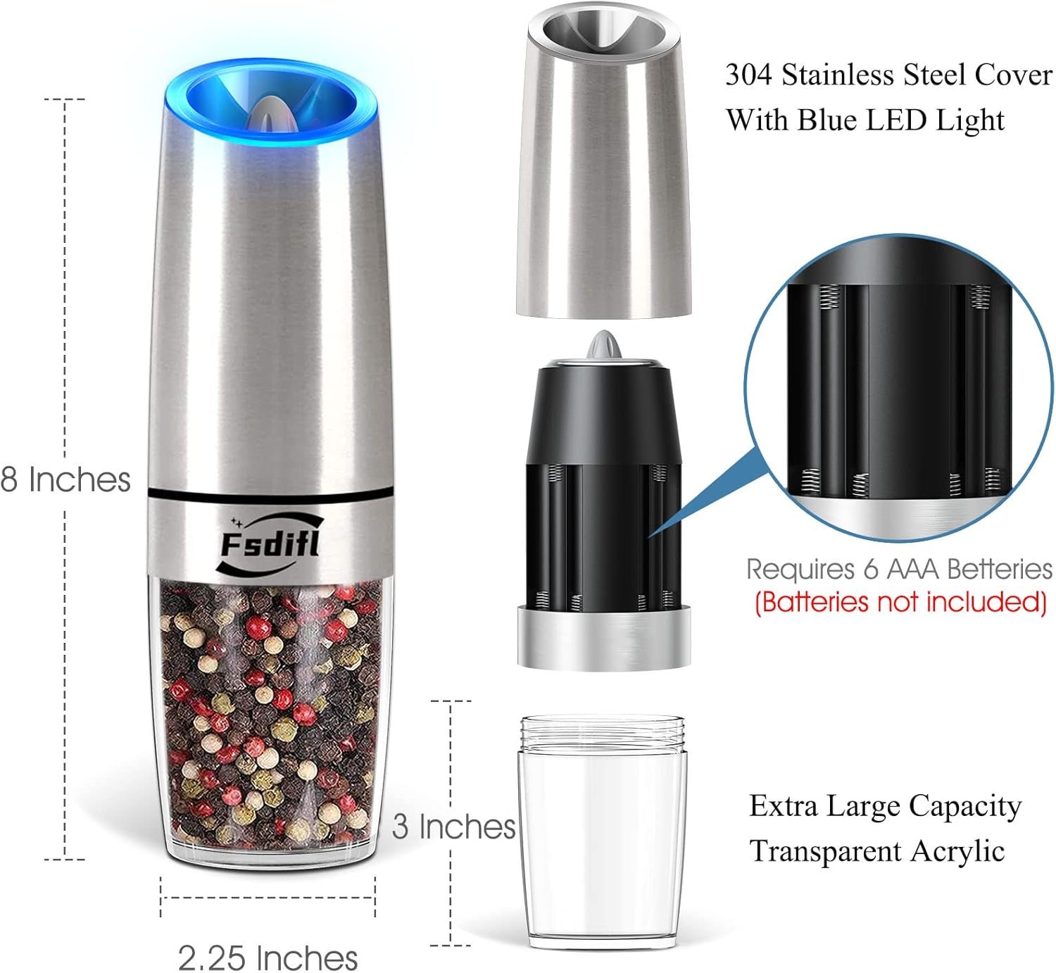 Gravity Electric Salt and Pepper Grinder Set – Adjustable Coarseness, Battery Operated Automatic Salt and Pepper Mills with Blue Light, One Handed Operation, 2 Pieces…