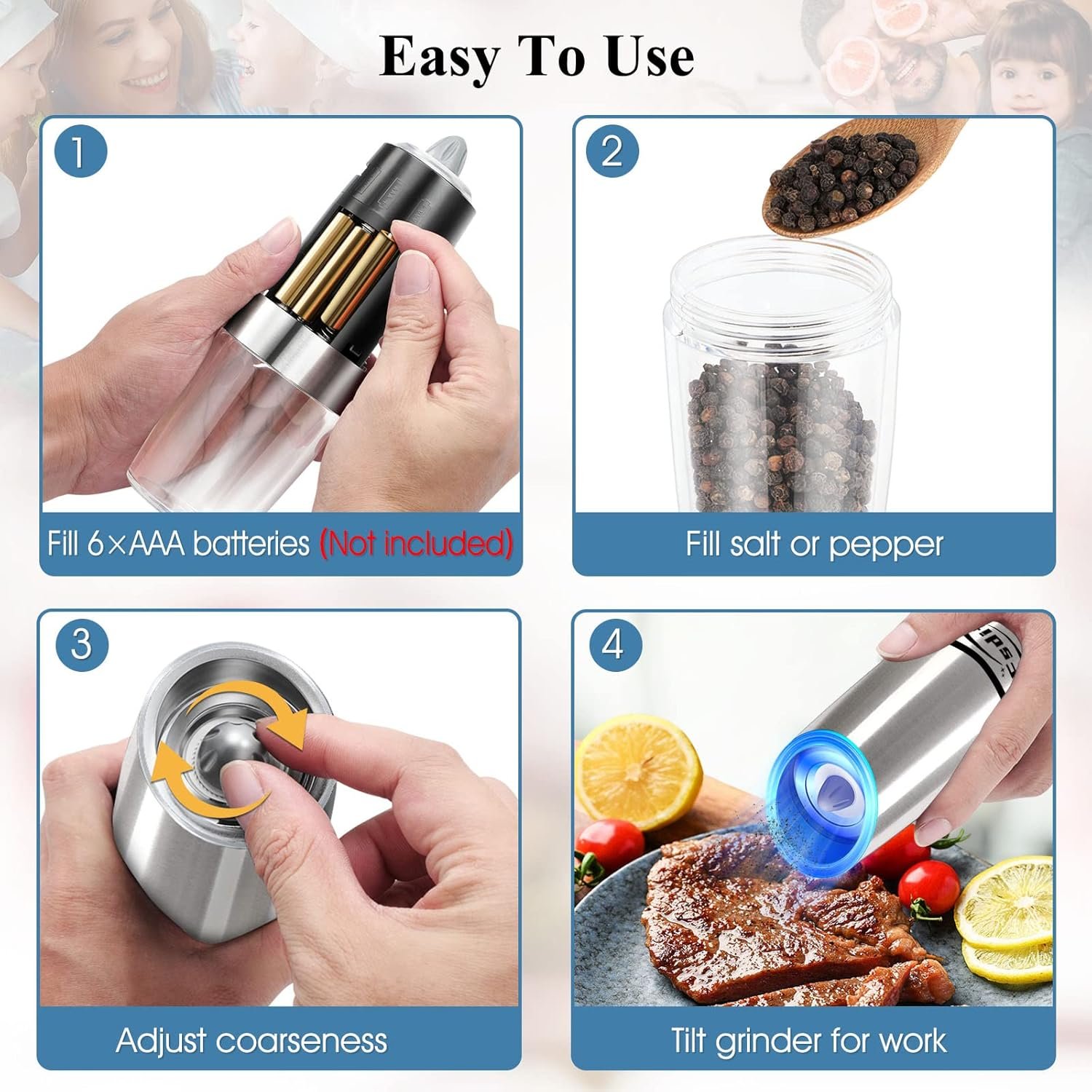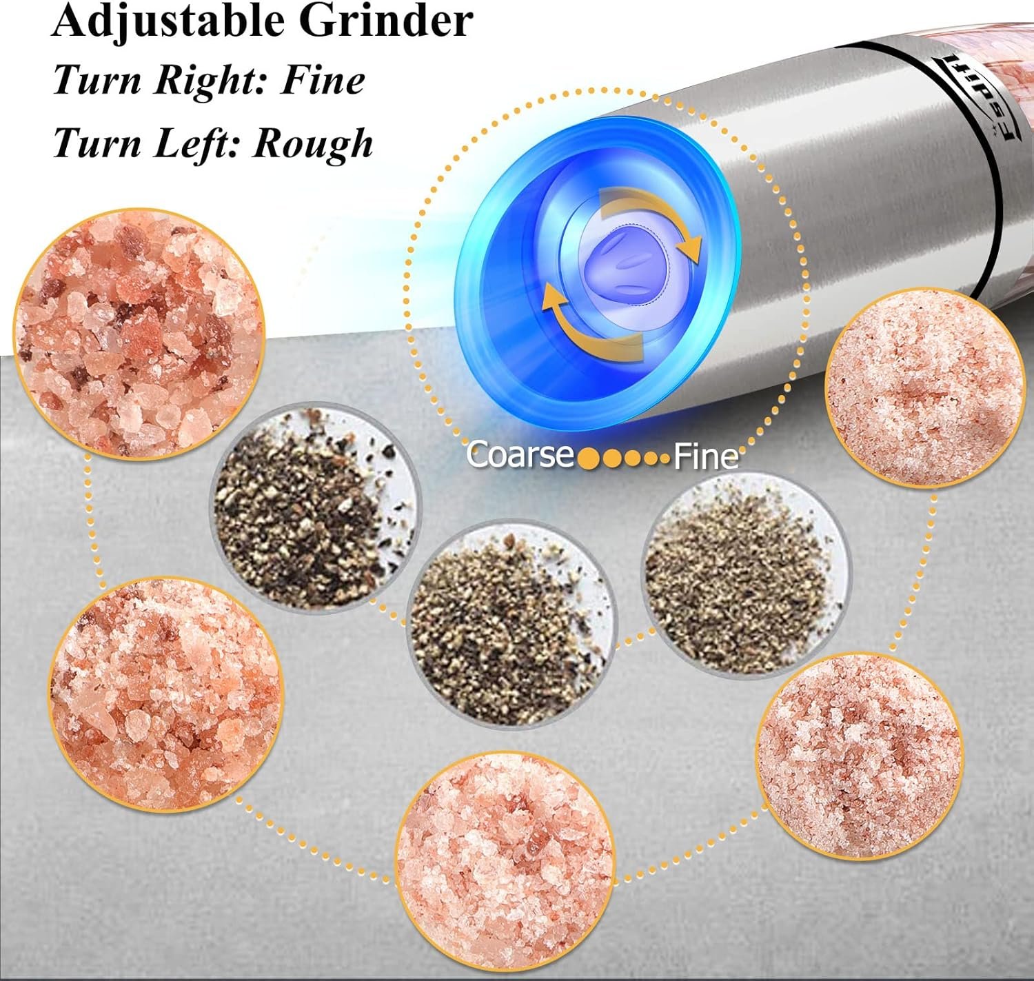 【New Upgrade】CONVENIENT ONE-HANDED OPERATION. Our electric pepper grinder set is gravity activated, no manual twisting, no buttons to push. The automatic salt and pepper grinder is battery operated, so you can get fresh ground spices with just simply flipping the grinder. Incredibly easy to use.