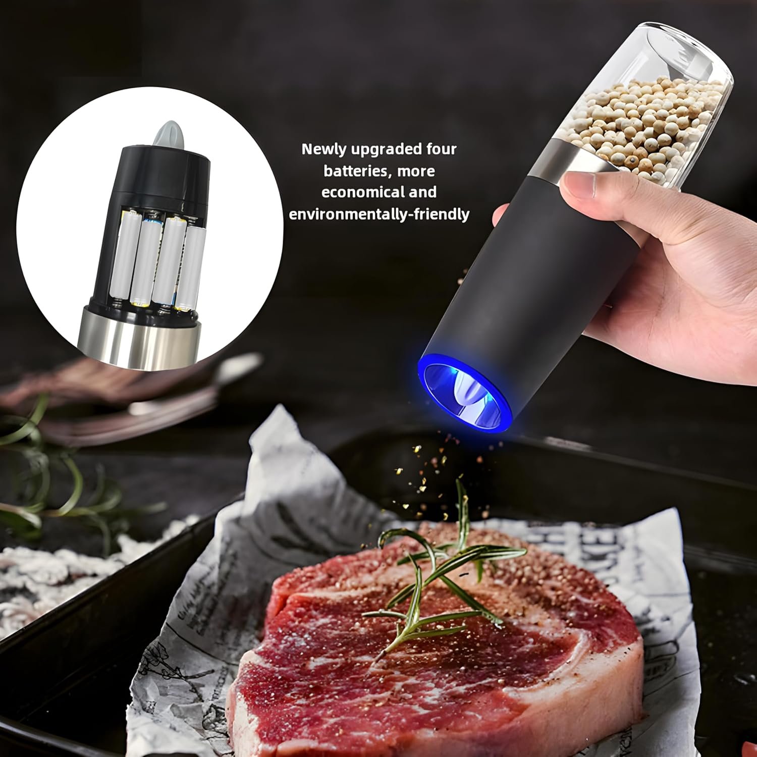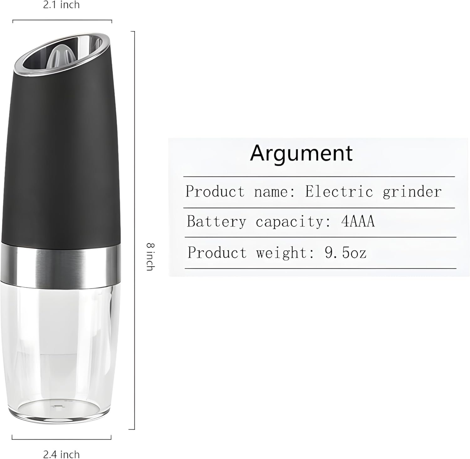 Our Electric Pepper and Salt Grinder with Gravity sensor switch, you even needn’t to press a button, Simply flipped the grinder and you will have fresh ground spices, Convenient and funny. hand movement is difficult to use easy to use sea salt and pepper grinding thickness can be manually adjusted according to the need to adapt to different food needs! Battery powered, each grinder requires 4 AAA batteries, the product comes with 8 AAA batteries, and can be used after receiving the product, in addition, 2 brushes are included for easy cleaning. If the ceramic head is not used, please use a brush to clean it to prevent the blockage of particles. The head of the product has a blue LED light, which can clearly see the amount of spices added in the outdoor. This grinder is the good helper for kitchens, restaurants, parties and outdoor picnics.