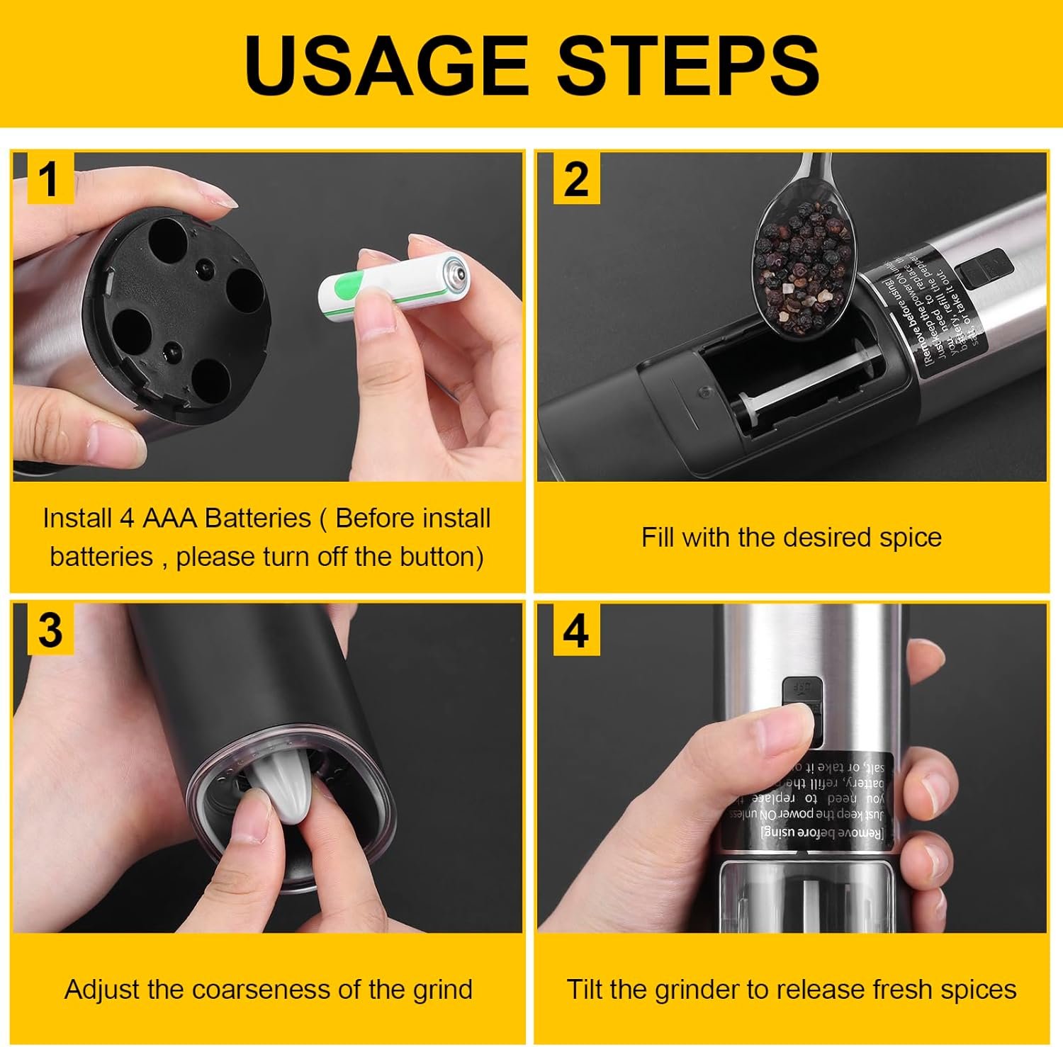 【Adjustable Grind Coarseness】: The electric salt and pepper grinder features adjustable grinding coarseness which can adopt an adjustment knob. The adjuster could be rotated for multiple circles between the finest and the coarsest grinding. The built-in premium ceramic cores enable you to choose from coarse to fine by just rotating the knob and get the apt coarseness in any spices.