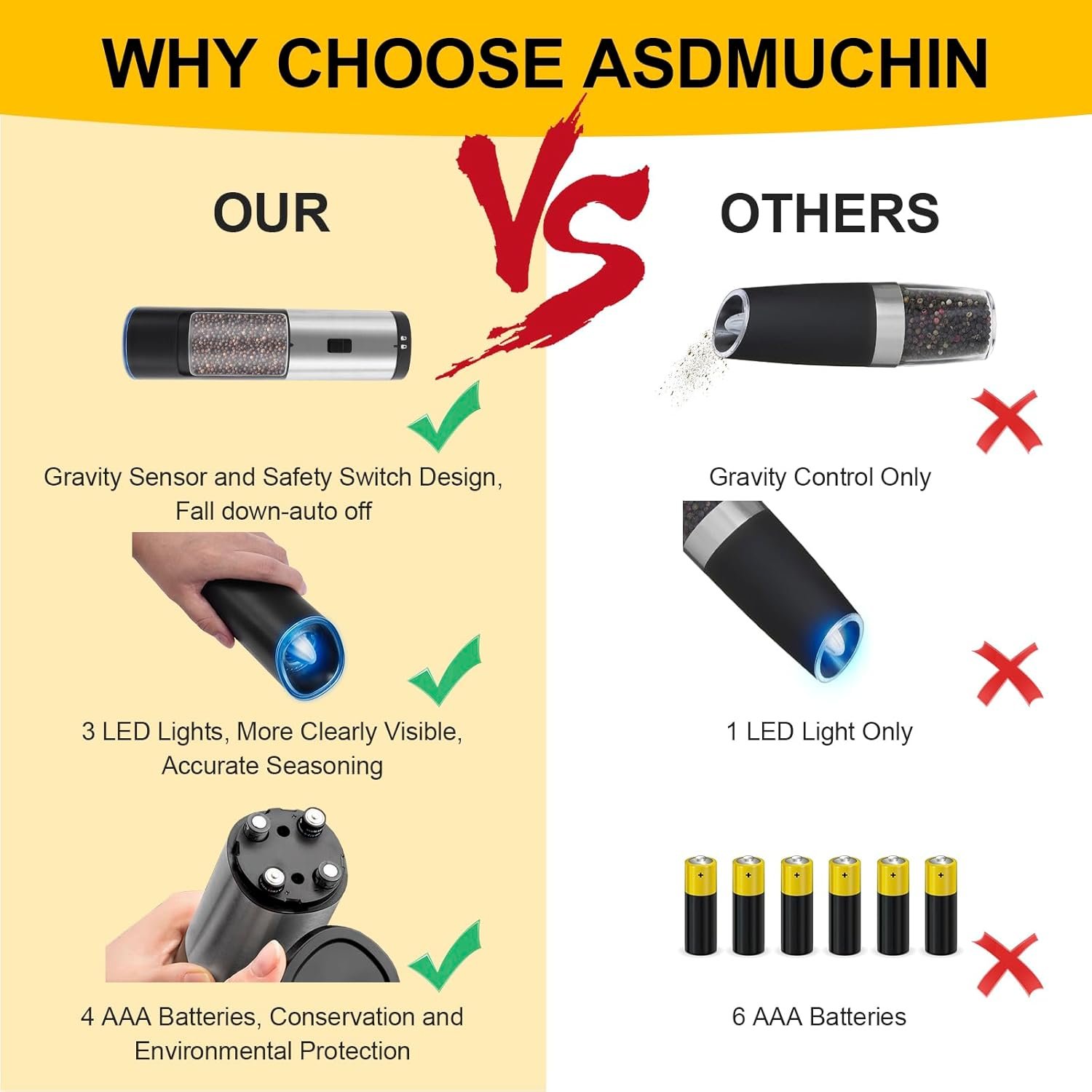 【Automatic Operation and Secured Upgrade 】: The electric salt and pepper grinder features both gravity sensing and a safety switch. This grinder adopts gravity sensing, without the need for buttons, and can be tilted for grinding with one hand. It is also equipped with a safety switch to prevent accidental self starting and ensure safe operation.