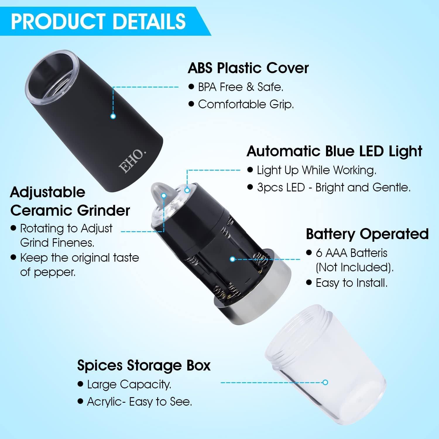 ☑️【Blue LED Light】: Not cheap-looking and boring white light anymore, blue light is not only bright but also gentle.When you have dinner with your family or loved ones, this gentle blue light adds a warm and romantic atmosphere.The blue LED light will turn on automatically during use,you can see exactly where your seasoning is landing.