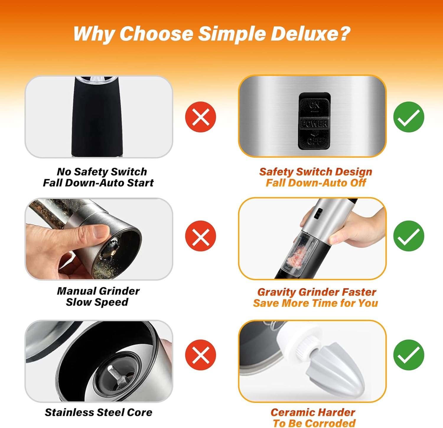 Blue LED Light: Our electric salt and pepper grinder built-in blue LED, as long as you flip your wrist, electric grinder will light up bright and soft light, helping you better grasp the amount of seasoning when cooking in a dim environment.