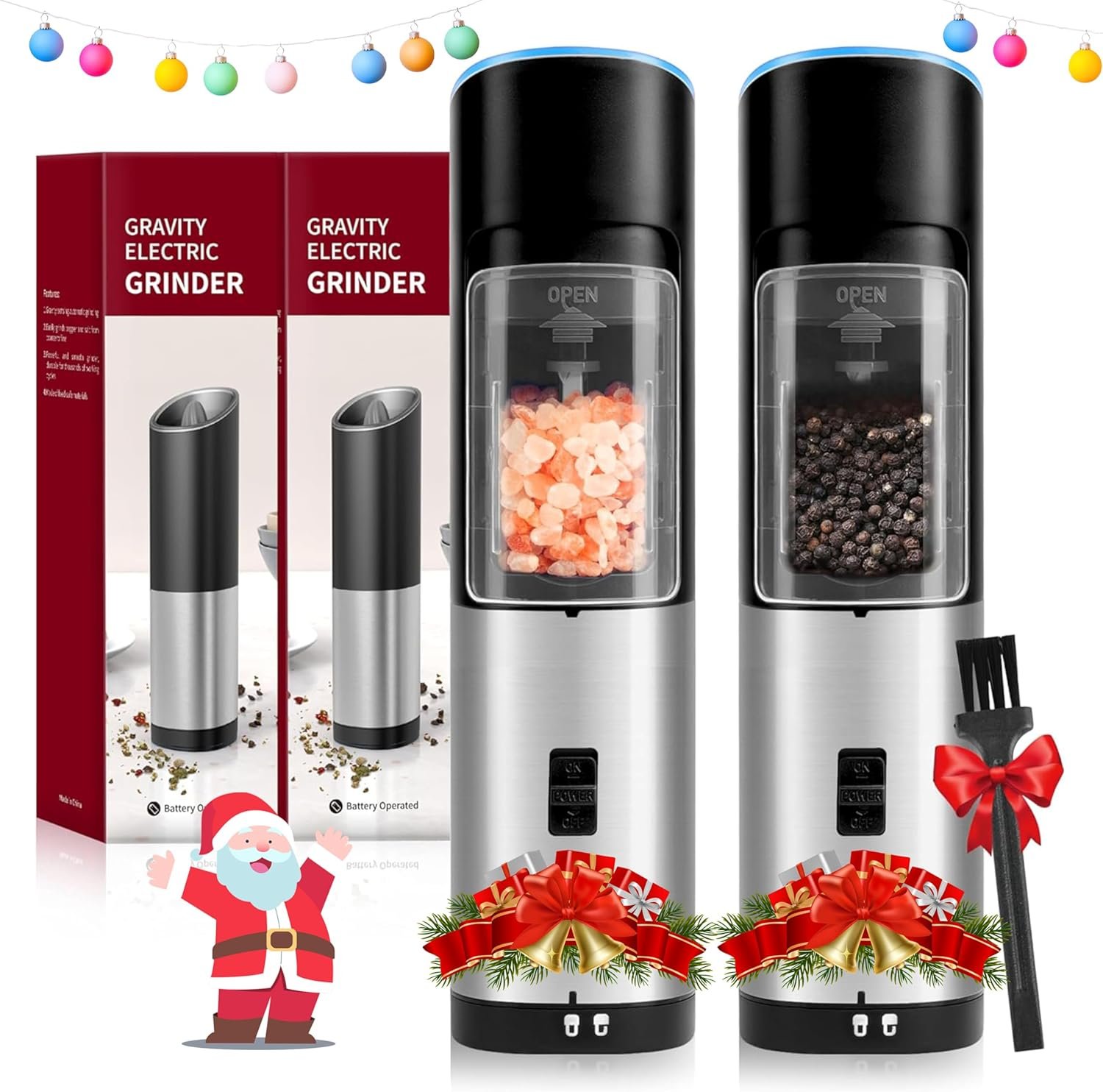 Gravity Electric Salt and Pepper Grinder Set of 2 Pack, Adjustable Coarseness, One Hand Automatic Shakers Mill, Battery Powered with LED Light, Brushed Stainless Steel Perfect for Kitchen BBQ