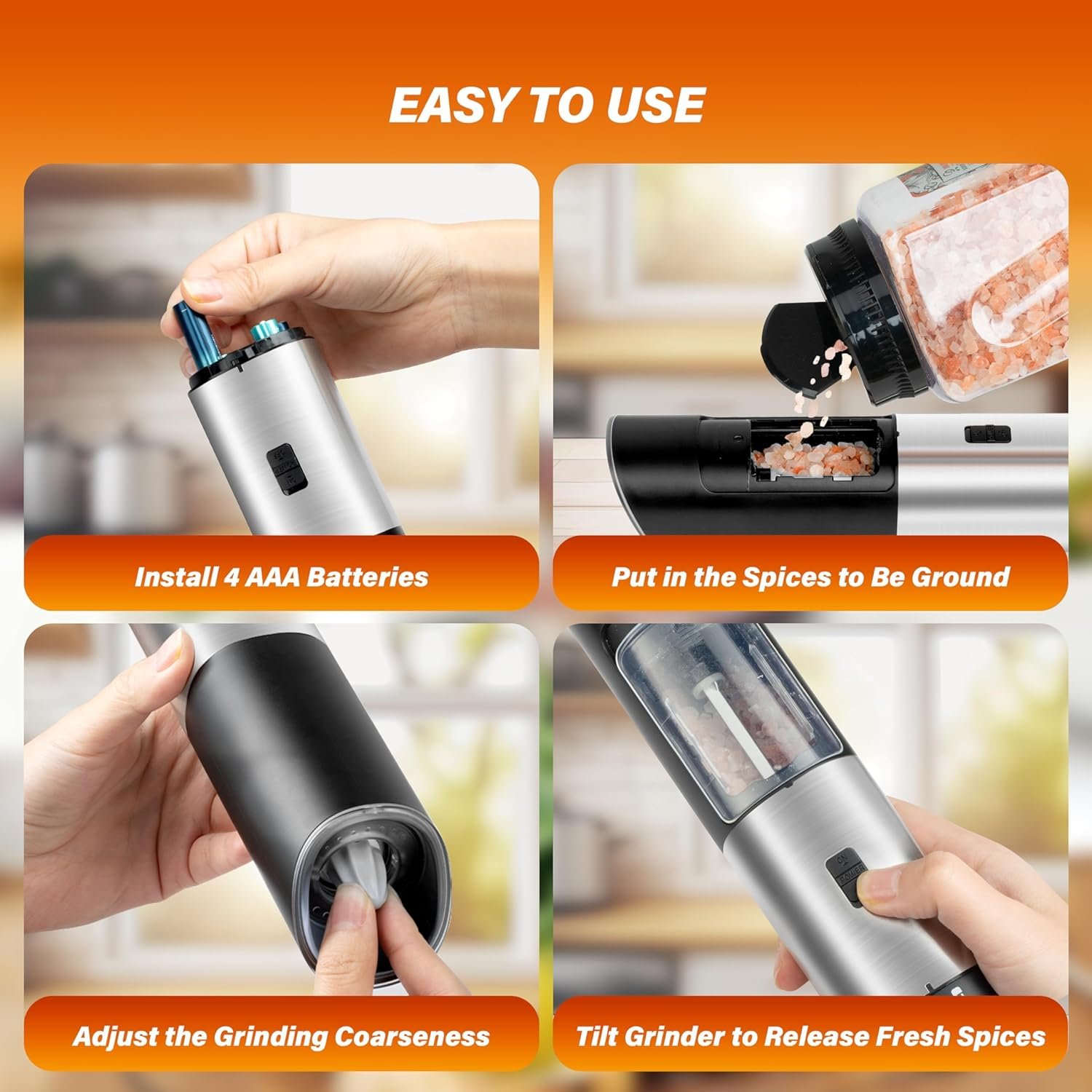Safety Gravity Sensor Design: Considering the safety of use, our automatic salt and pepper grinder set adopts gravity induction design, added ON/OFF button to prevent wrong opening. Requires 4x AAA batteries (not included), helping you get fresh spices.