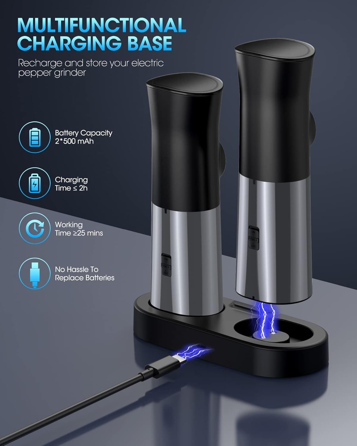 USB Rechargeable: Upgraded electric pepper grinder with built-in rechargeable battery, no need to spend extra money on batteries like other battery operated salt and pepper grinders.