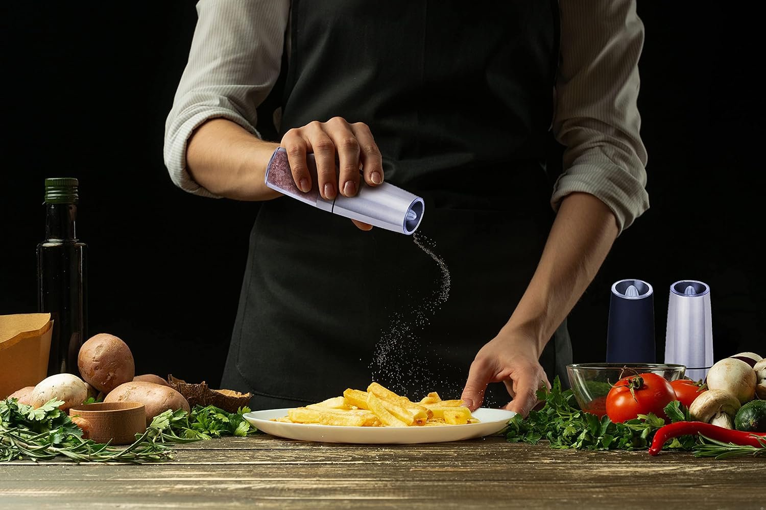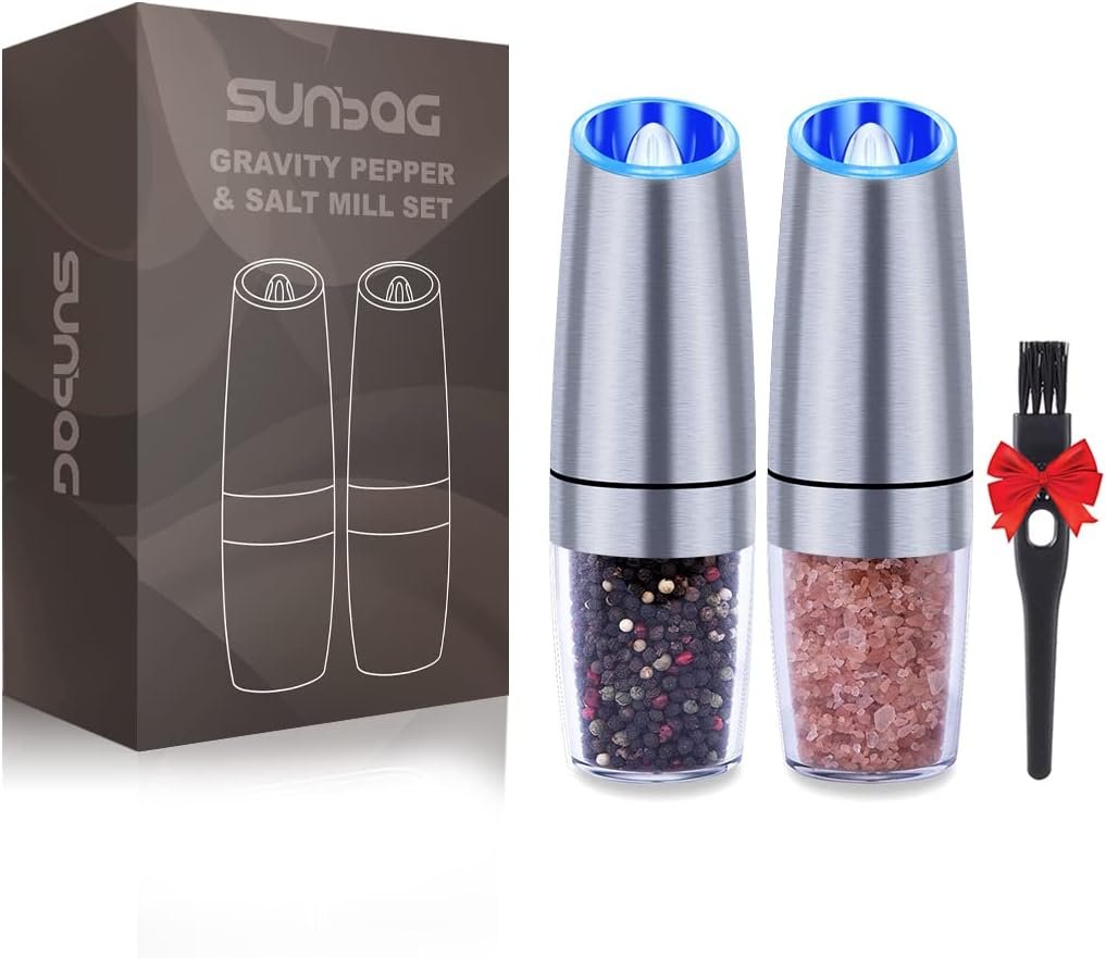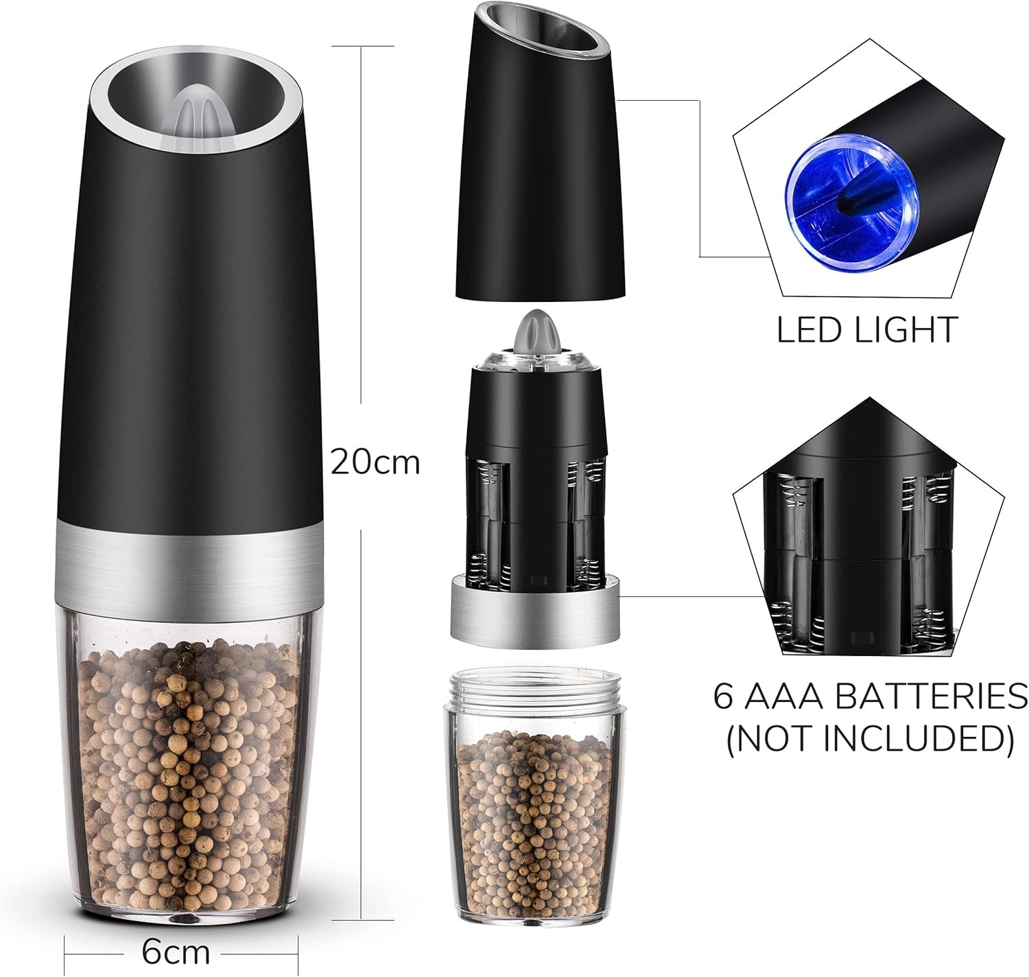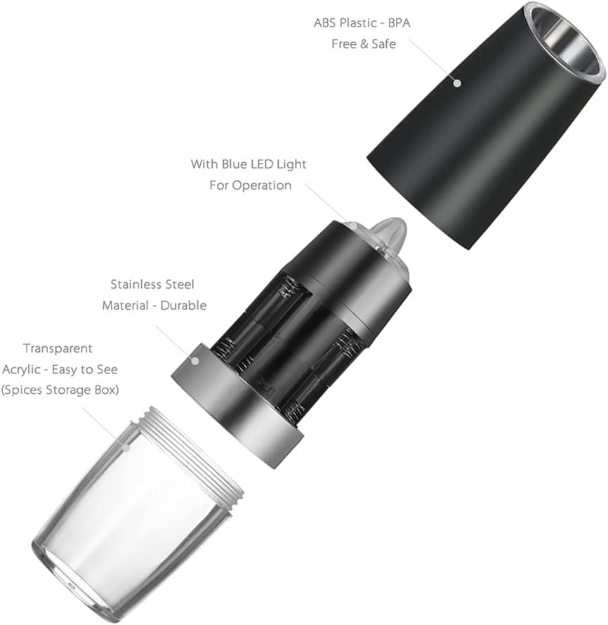 【Gravity Automatic Operated】: Battery powered-Each grinder requires 6 AAA batteries (batteries not included).Our salt and pepper grinder use advanced gravity sensing system.Simply tilt the grinder (greater than 90 degrees) and you get fresh salt, pepper or spices.No need to operate with both hands!No need to press any button!No need to waste more time!