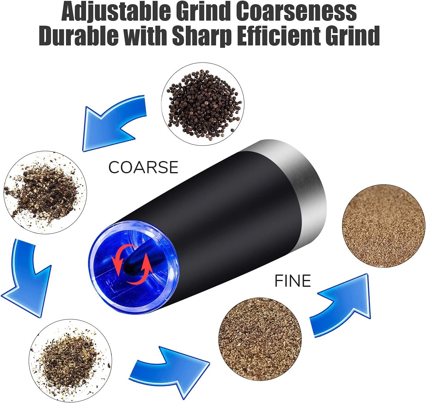 【Adjustable Grind Coarseness】: Our salt and pepper grinder uses high hardness ceramic mill core.By rotating the top rotor,you can grind different coarseness settings of salt,pepper or spices according to your needs.Clockwise rotation for fine particles,counterclockwise rotation for coarse particles.