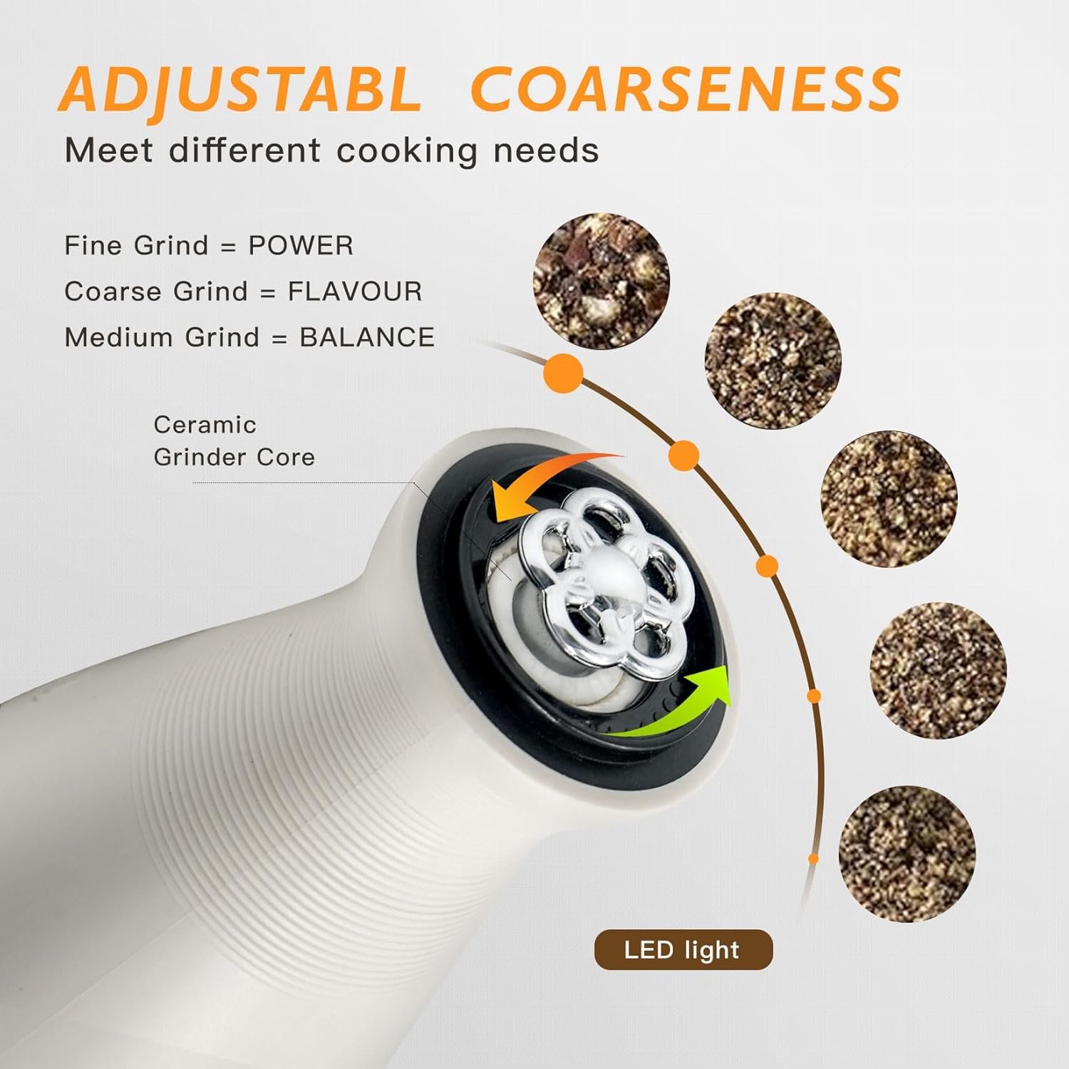 Adjustable Coarseness Salt Pepper Mill Set for Perfect Seasoning – Whether you prefer fine or coarse grinding, our easy-to-adjust ceramic grinder lets you customize your spice texture with a simple twist. Enjoy precise control over the seasoning of your dishes, ensuring perfect flavor every time