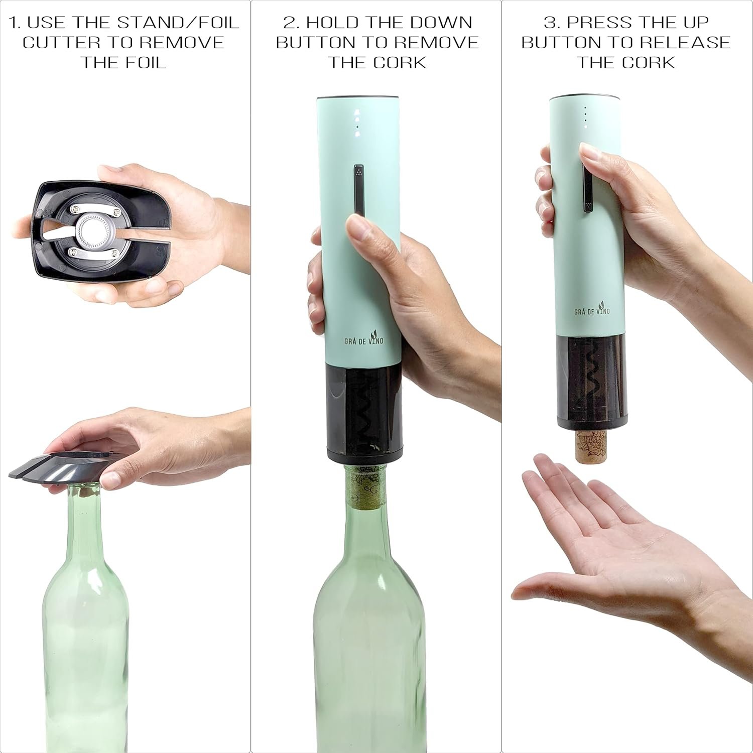 Now you can easily and effortlessly open any bottle of wine with a simple touch. Our Gra De Vino stainless steel electric wine opener includes a black stand/foil cutter and a USB charging cable. Our elegant and durable wine opener will allow you to open a bottle of wine in 6 seconds.