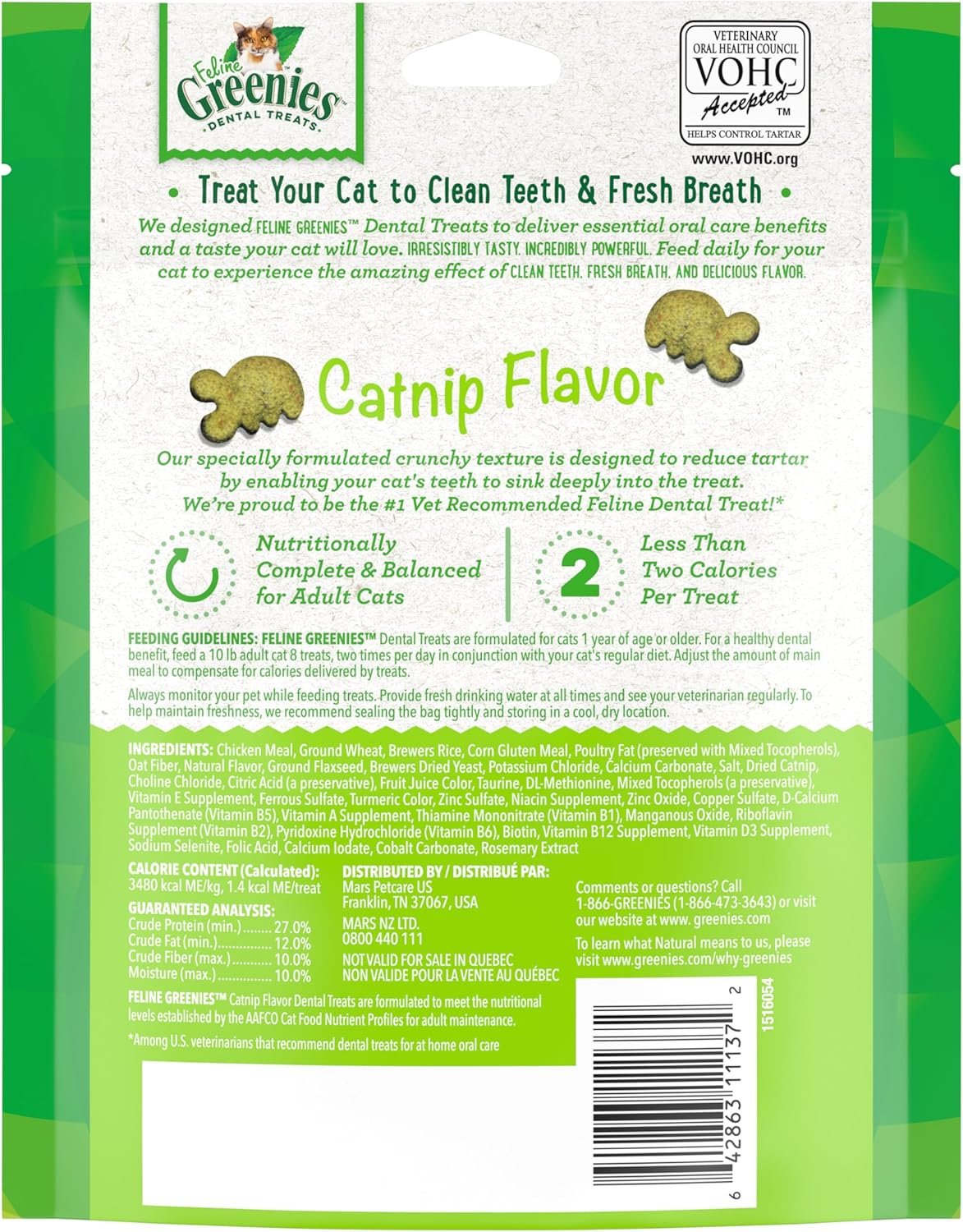 This convenient pouch contains 4.6 oz. of FELINE GREENIES Crunchy Dental Treats in Catnip Flavor