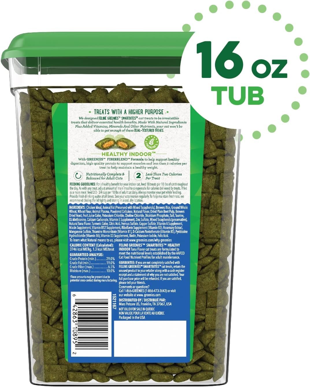 Contains one (1) 16 oz. tub of FELINE GREENIES SMARTBITES HEALTHY INDOOR Natural Treats for Cats Tuna Flavor