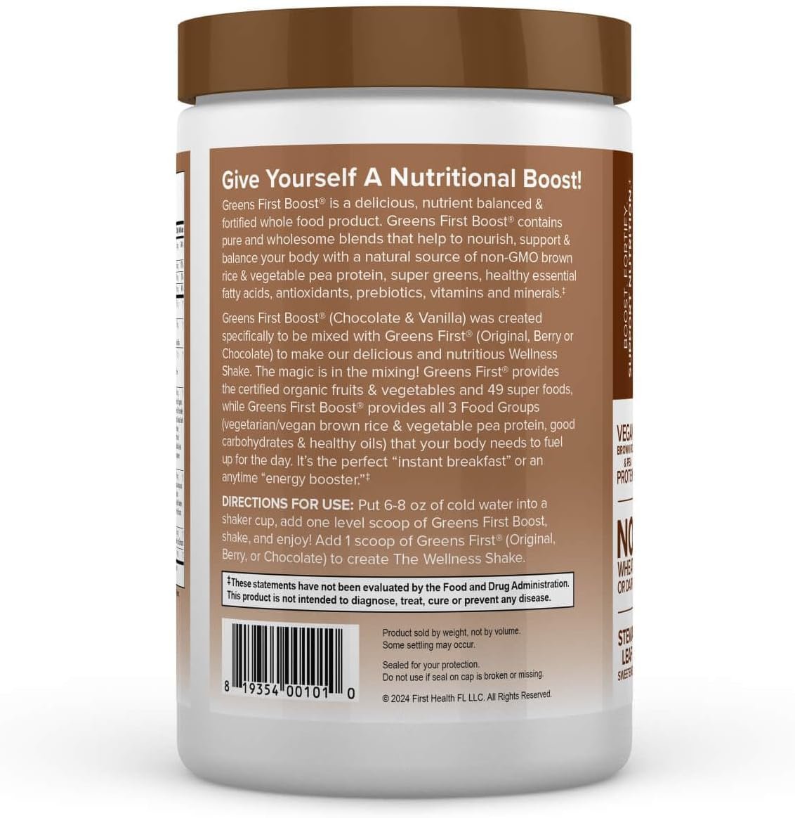 Vegan, Plant-Based Protein. Each serving of Greens First Boost provides five grams of premium-quality vegan protein derived from non-GMO brown rice and pea protein isolate, supporting muscle health and recovery.