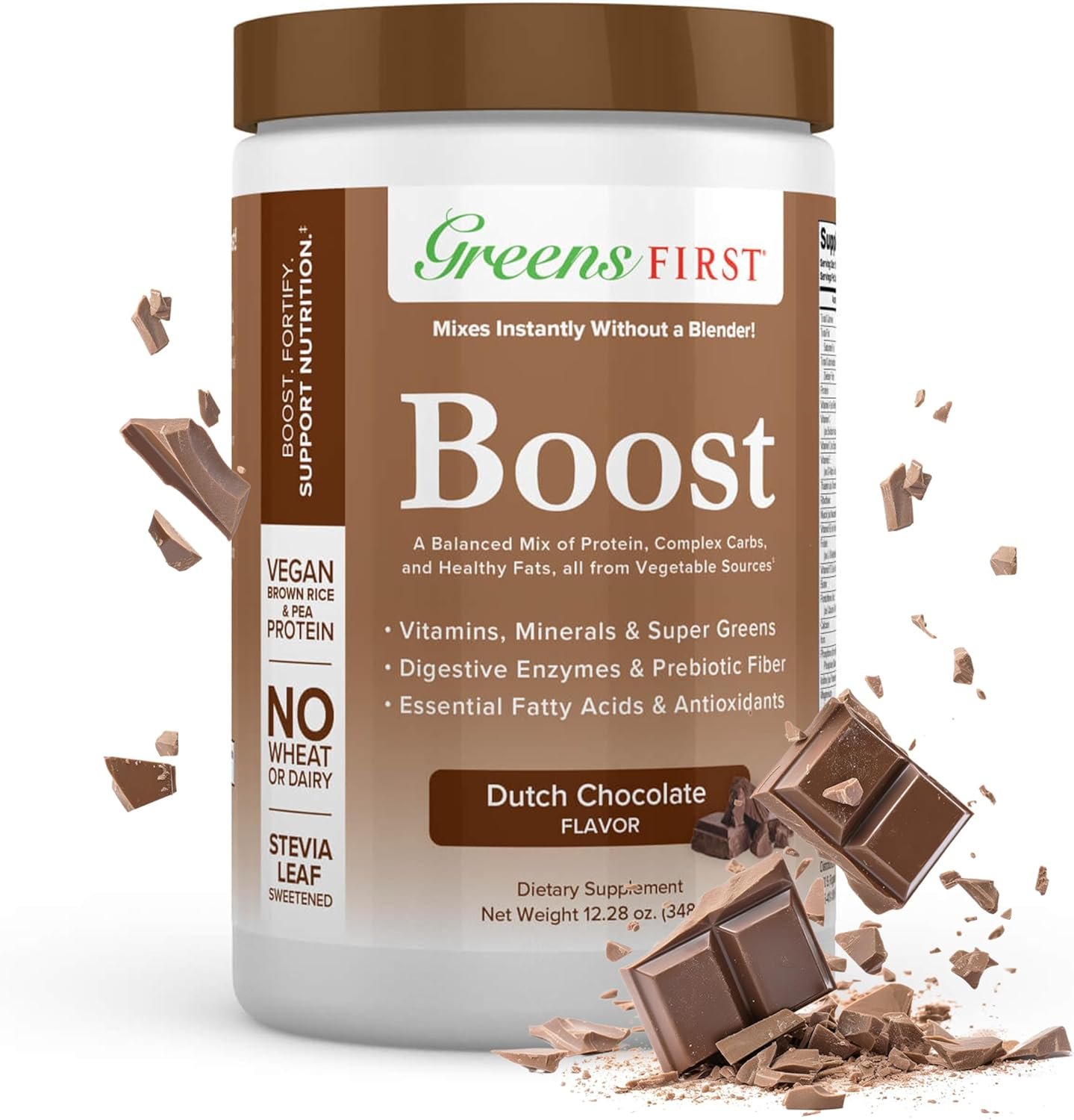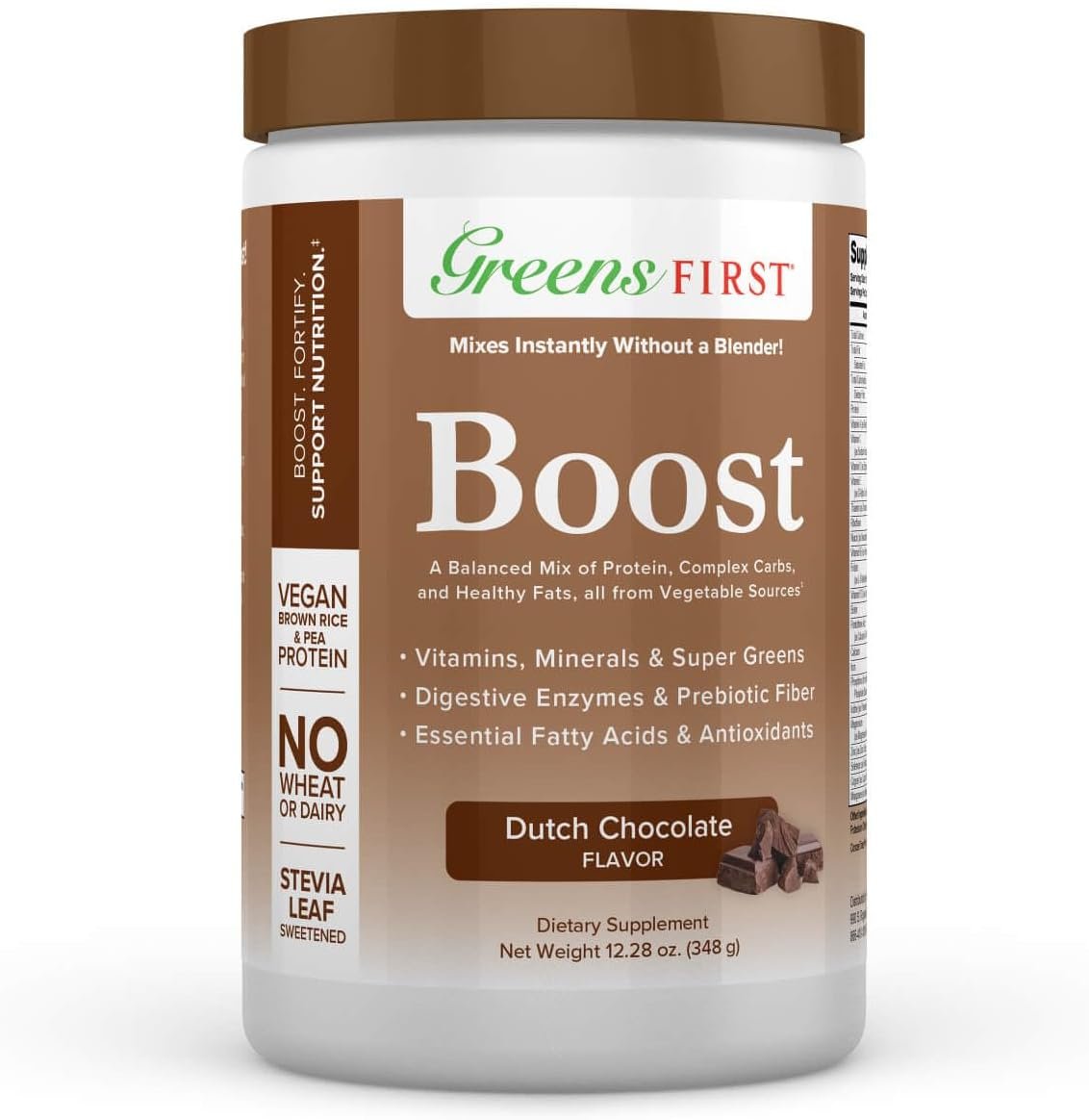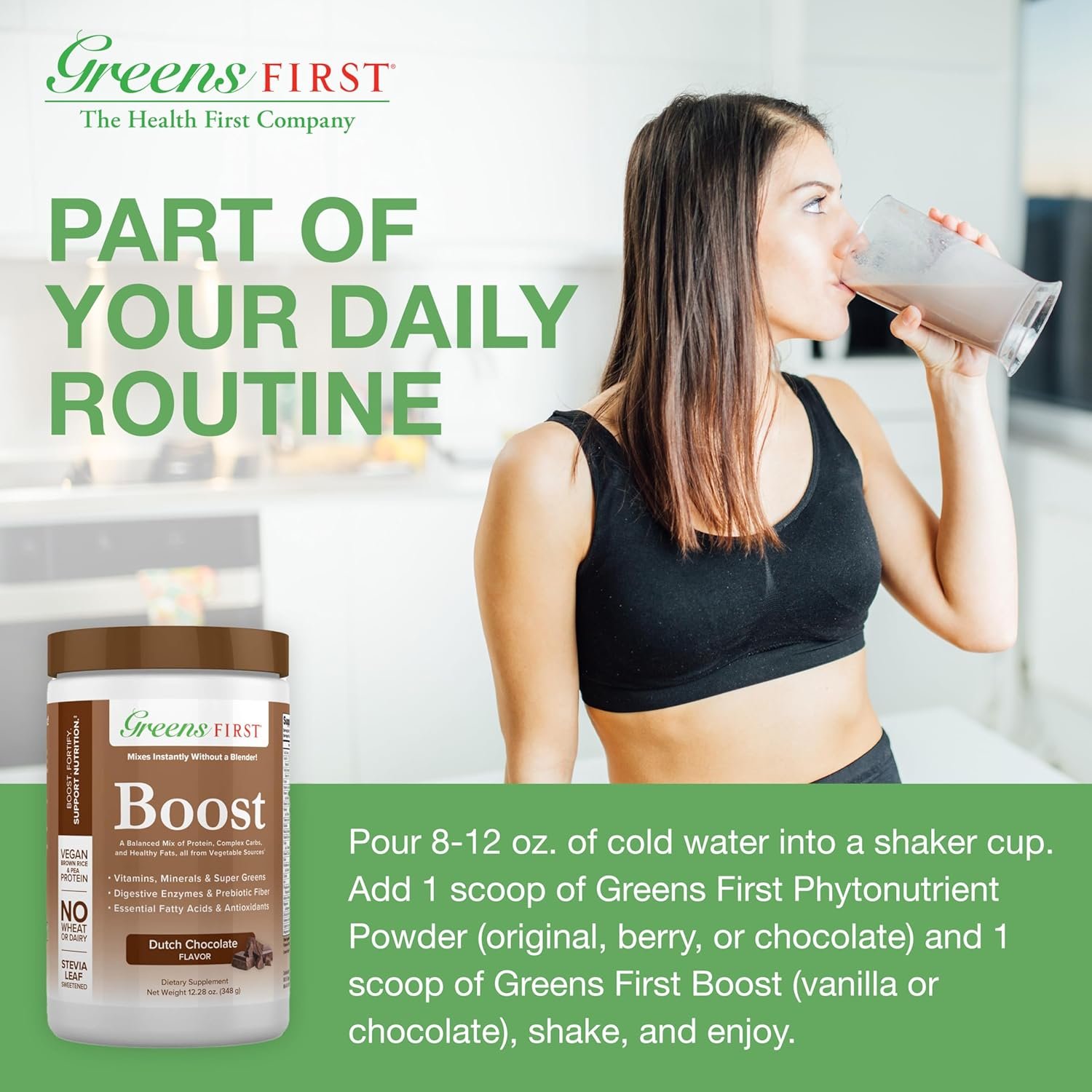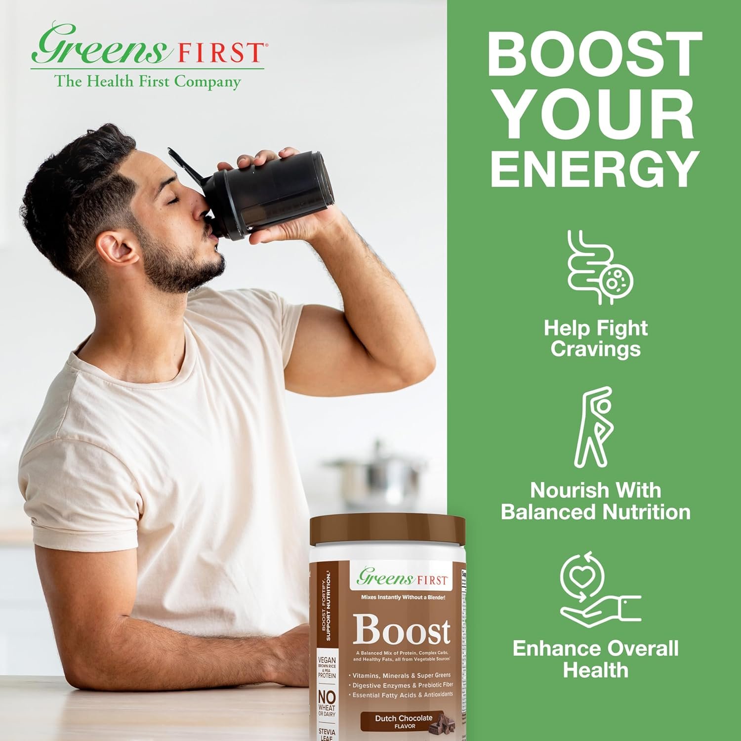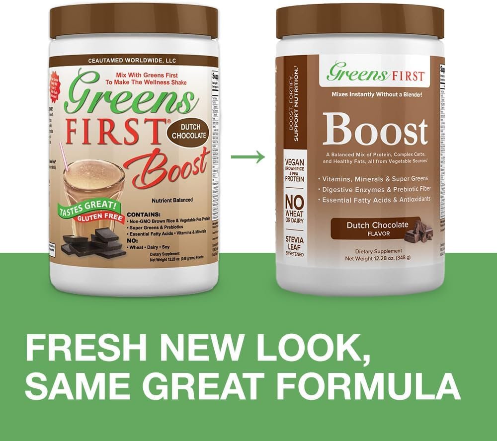 Versatile and Delicious. Greens First Boost comes in indulgent French Vanilla or rich Dutch Chocolate flavors, perfect for creating a nutritious wellness shake when mixed with Greens First Phytonutrient Powder. Discover a better way for providing a delicious and convenient way to boost energy and enhance overall health with Greens First Boost!