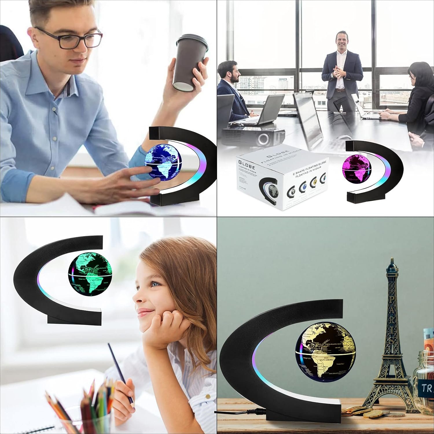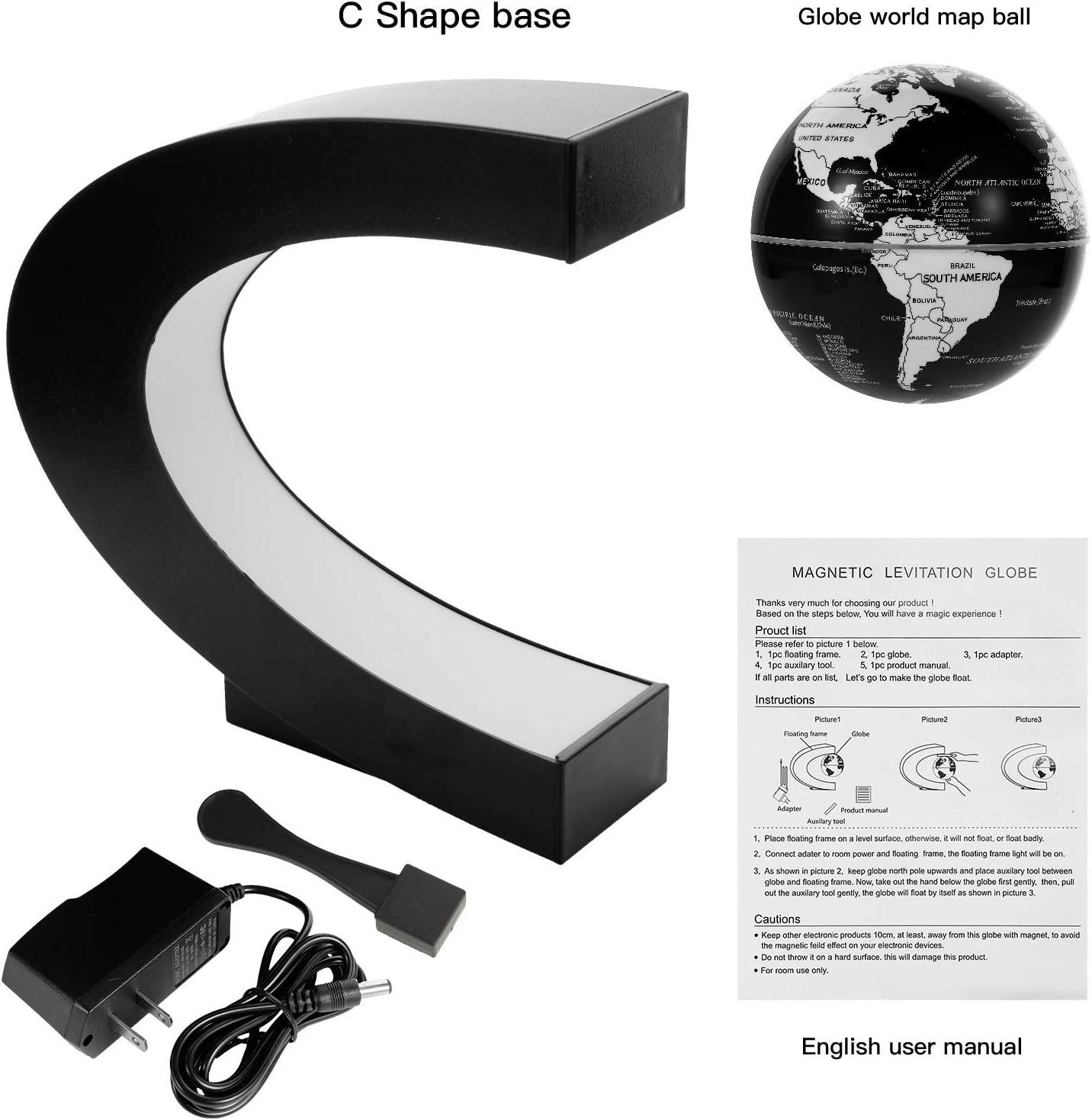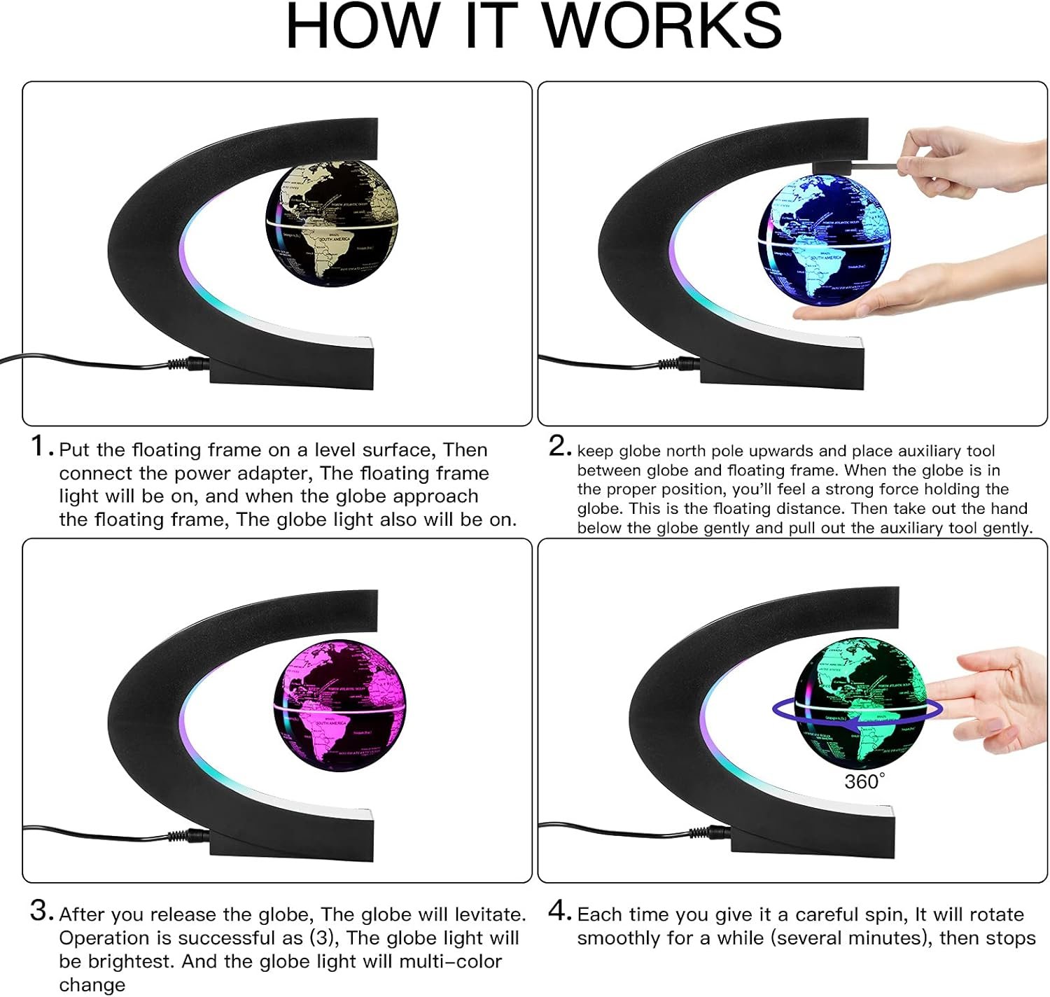.Please kindly be advised that the globe doesn’t float centered/middle in the “C” shape frame, it floats closer to the top, please refer to the video on the seventh picture.