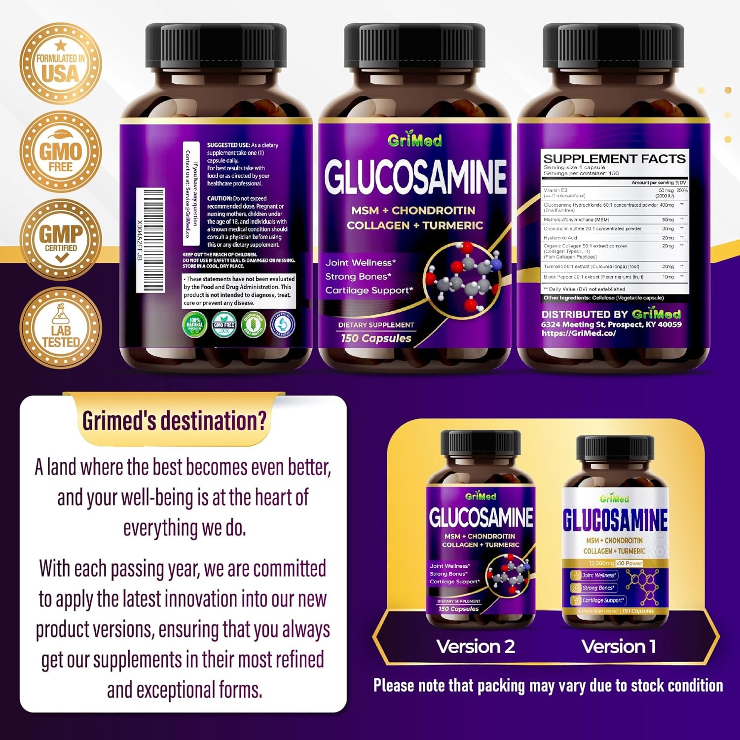GriMed Glucosamine 12,000mg – X12 Power with MSM, Chondroitin, Collagen, Turmeric for Joint Wellness, Strong Bones, Cartilage Support – USA Made & Tested