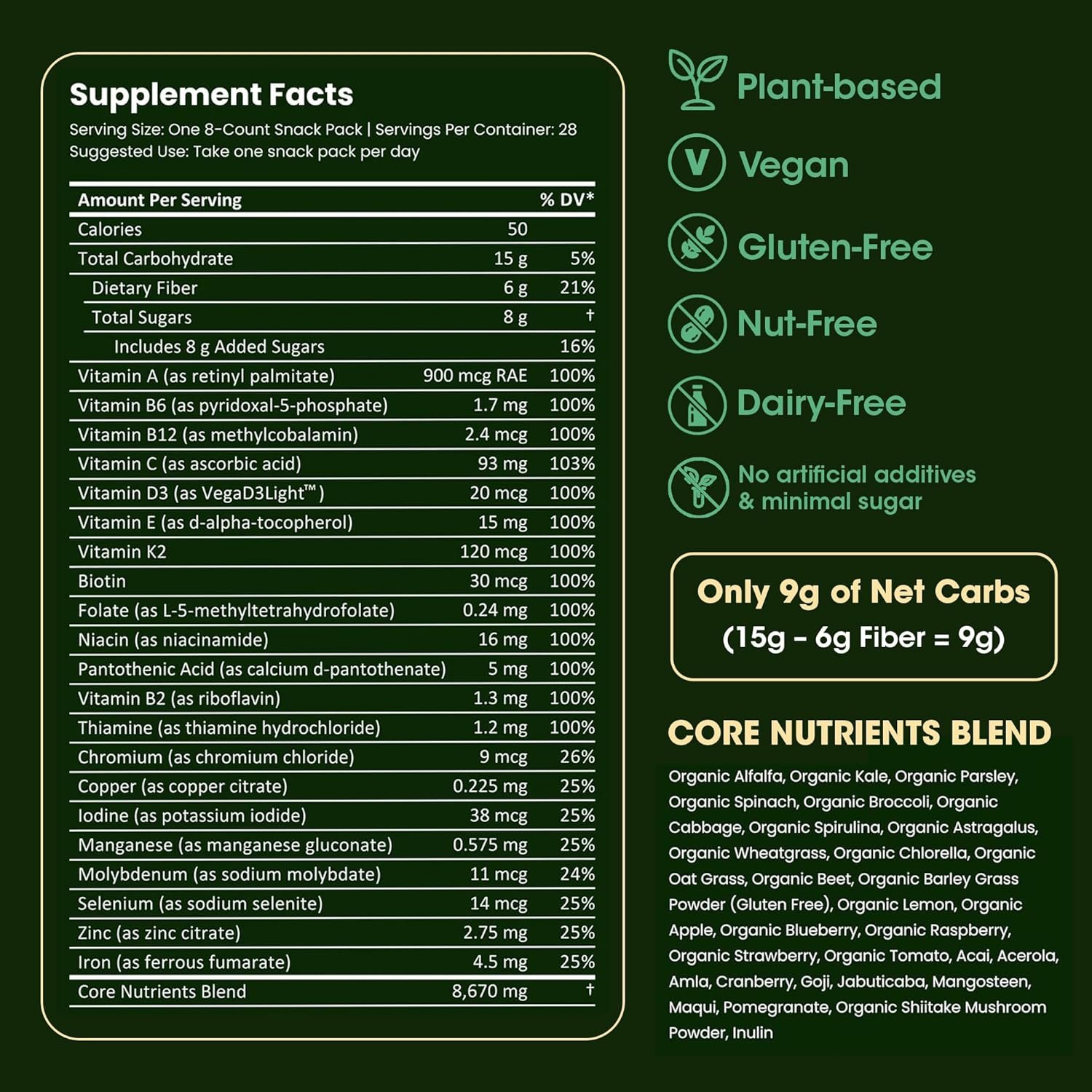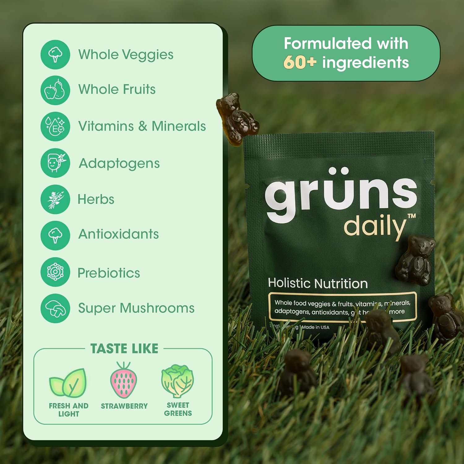 Formulated to Fit Your Life: At Gruns, we believe that foundational nutrition should be simple and convenient for everyone. We’re dedicated to bringing comprehensive and complete nutrition to you through our gummies, formulated from 60 nutrient-dense and whole-food ingredients.