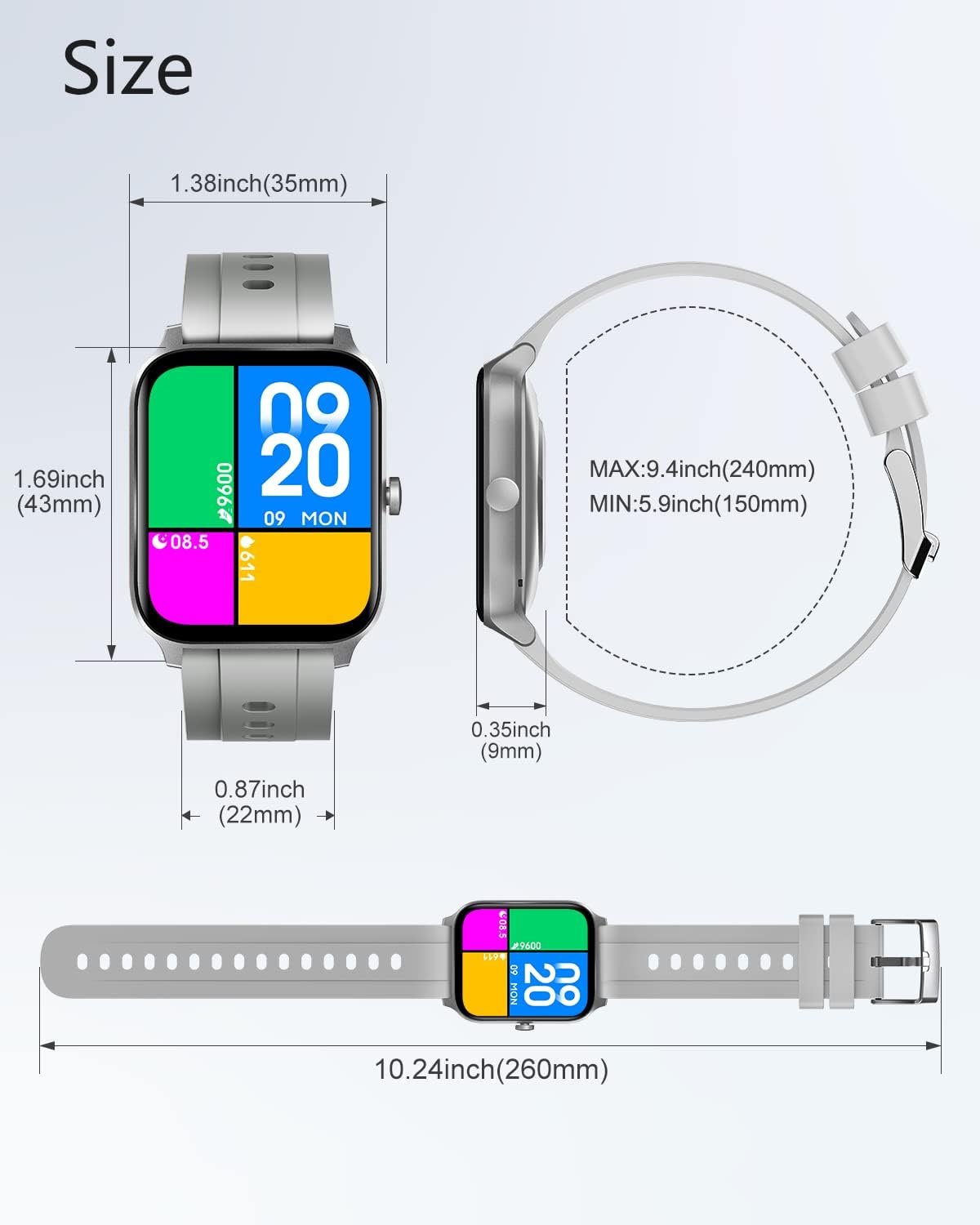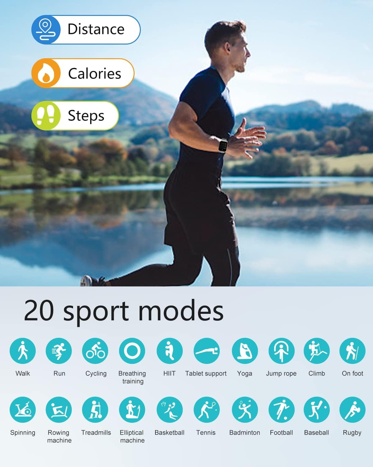 20 Sports modes: Run, Walk, Cycling, Breathe, HIIT, Plank, Rope Skipping, Yoga, Climb, Hiking, Spinning bike, Rowing, Stepper, Elliptical, Basketball, Tennis, Badminton, Football, Baseball, Rugby.Automatic monitoring of heart rate and oxygen saturation 24 hours a day, 7 days a week.Receive text messages, calls, SNS notifications, etc. from the mobile phone, but cannot reply to messages.Automatically detect and analyze sleep data.Music control: Play/Pause, Play next song/previous track and volume controlIP68 Waterproof: You can wear it while swimming in pools and open water. Don’t worry about sweat getting your watch wet during workout.Sedentary reminder: This watch will vibrate to remind you of getting up from the desk and moving around.Wrist Sensor: Lift wrist to activate the screen. You can also turn the sensor off when sleeping in the night from disturbing by the screen light.Camera control: Swing watch or touch the screen to take photos (photos were captured by smartphone)Other practical functions: Silent Alarm Clocks, Do not disturb, Find your phone, Find your watch, stopwatch, countdown timer, Flashlight, Battery-saving mode, screen lock.