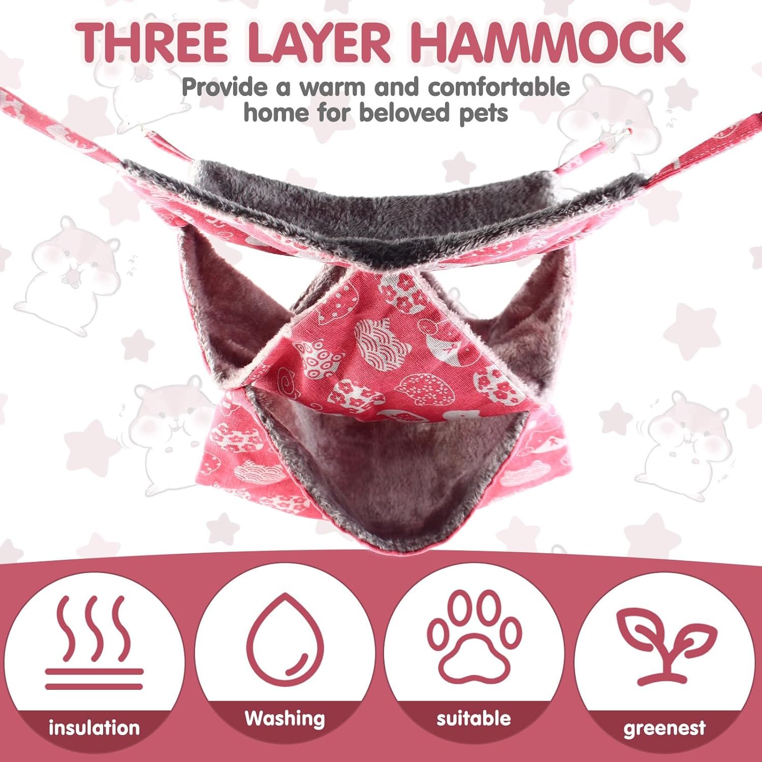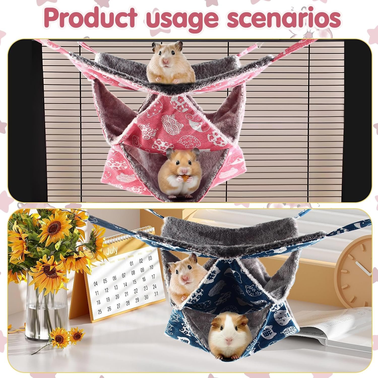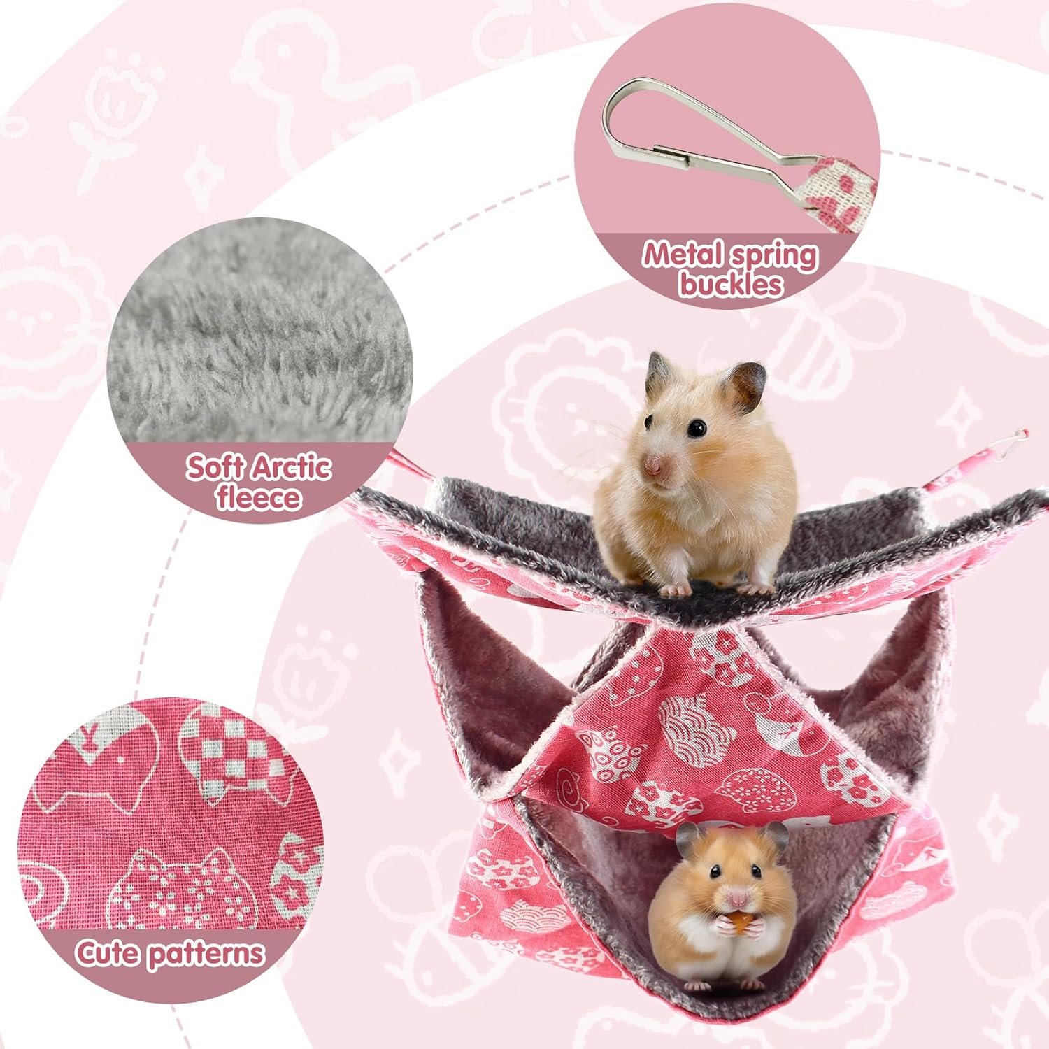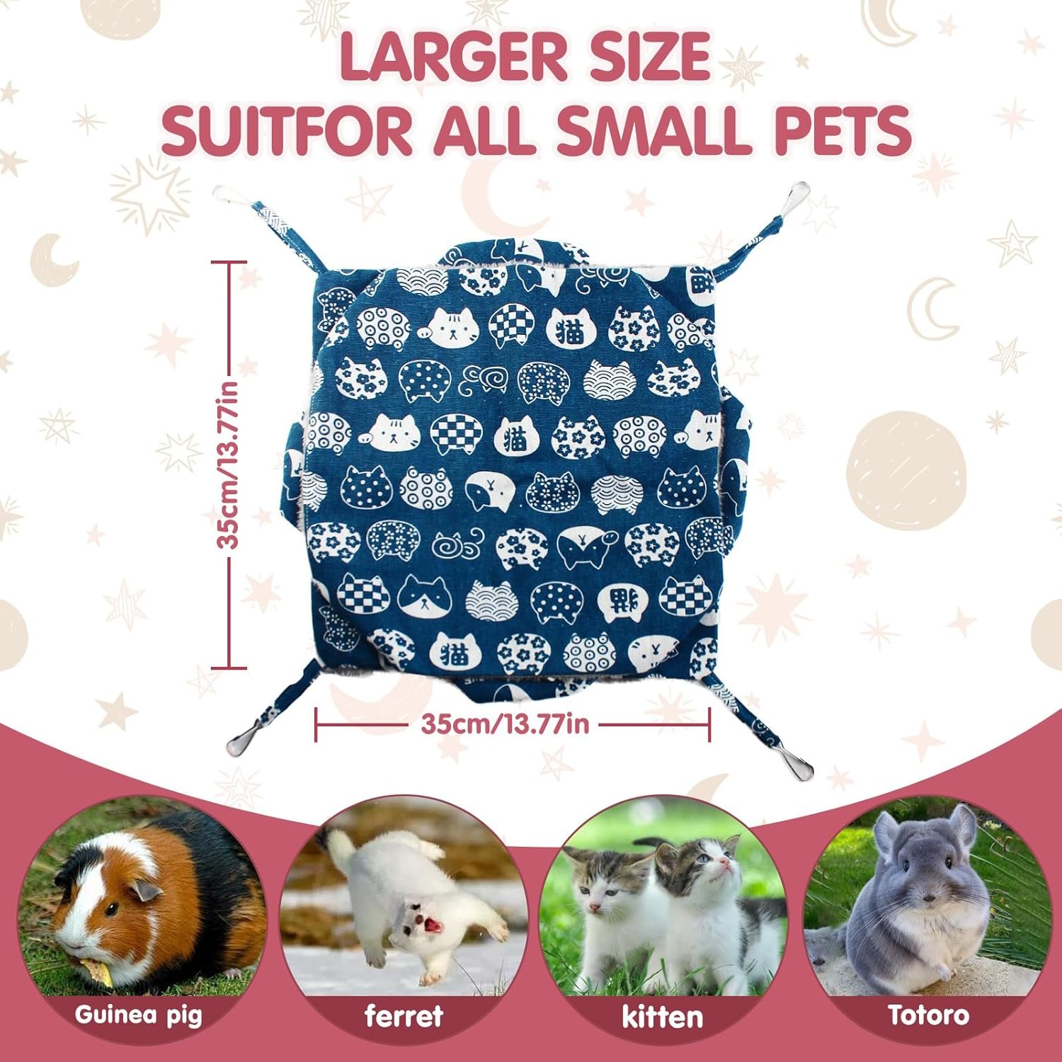 Suitable Size: The small pet cage hammock is 35×35 cm (13.77×13.77 in) with 4 clips. It suits most small animals like hamsters, parrots, ferrets, mice, kittens, and chinchillas, providing ample play and sleeping space