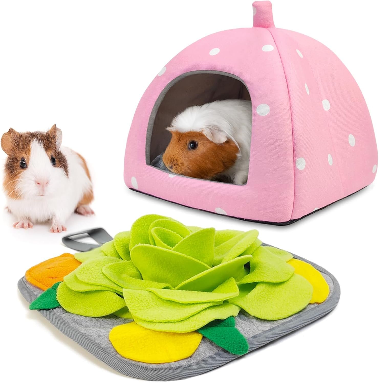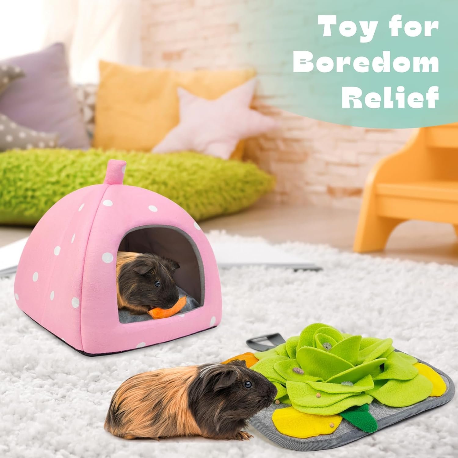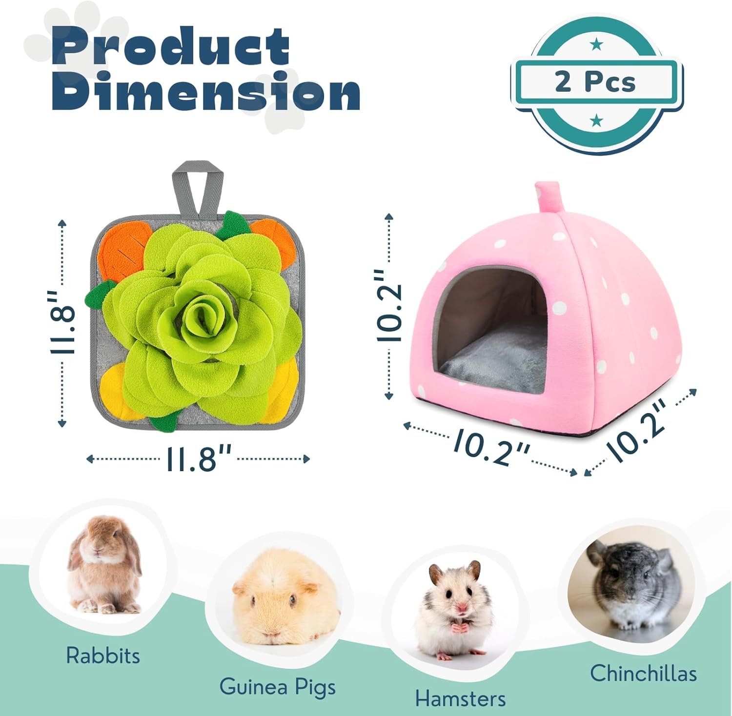 Suitable for dwarf rabbits, guinea pigs, hedgehogs, chinchillas, rats, and other small animals, this combination of the hideout and foraging mat adds extra enjoyment to their habitat. It offers comfort, entertainment, and enrichment for your furry friends, making their lives more joyful and fulfilling.