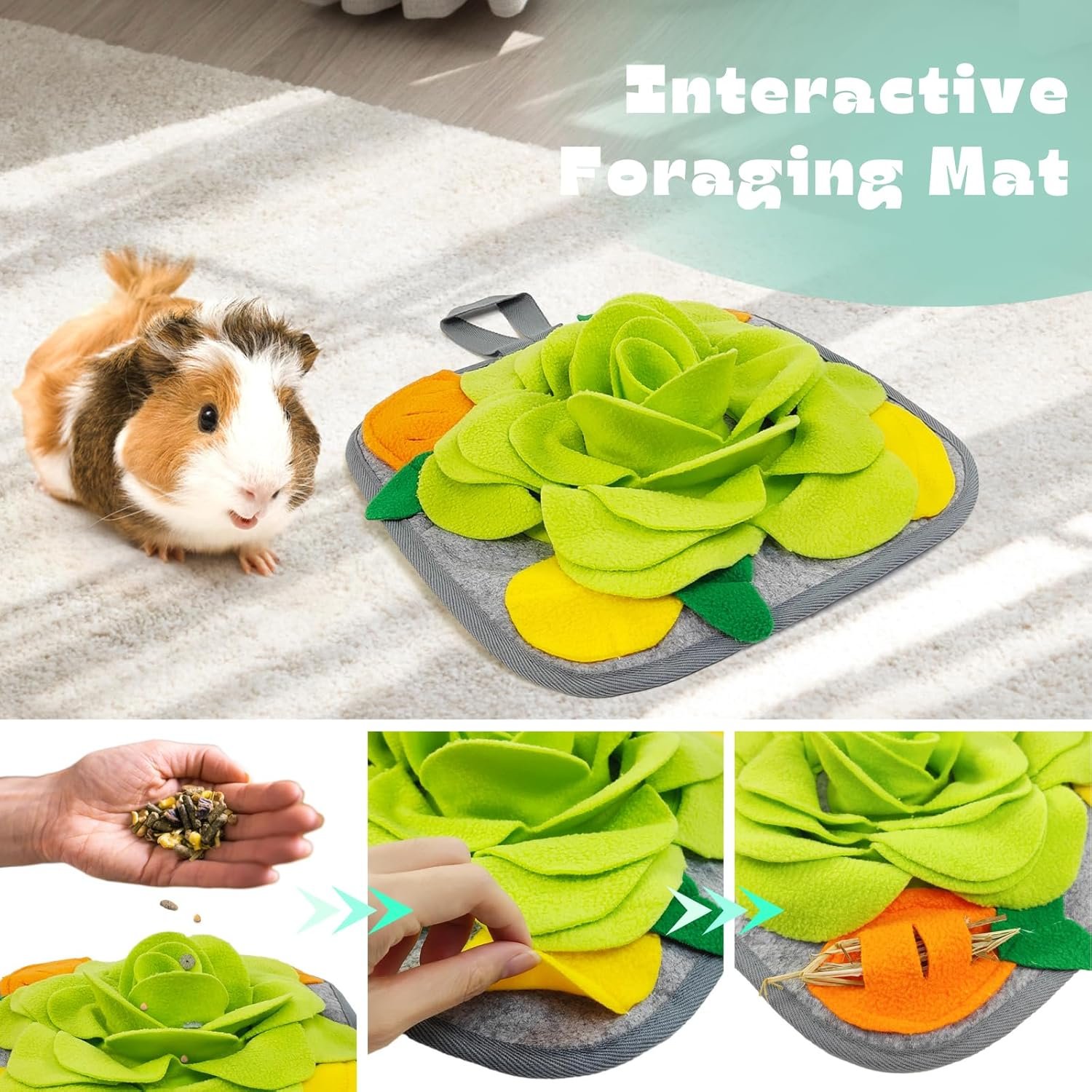 Interactive Foraging Mat: Including an interactive feeding mat with various folds and crevices, offering a fun and challenging experience for your pets. Hide treats or hay in the corners and gaps, prolonging the food-dispensing time and engaging your pets in the process.