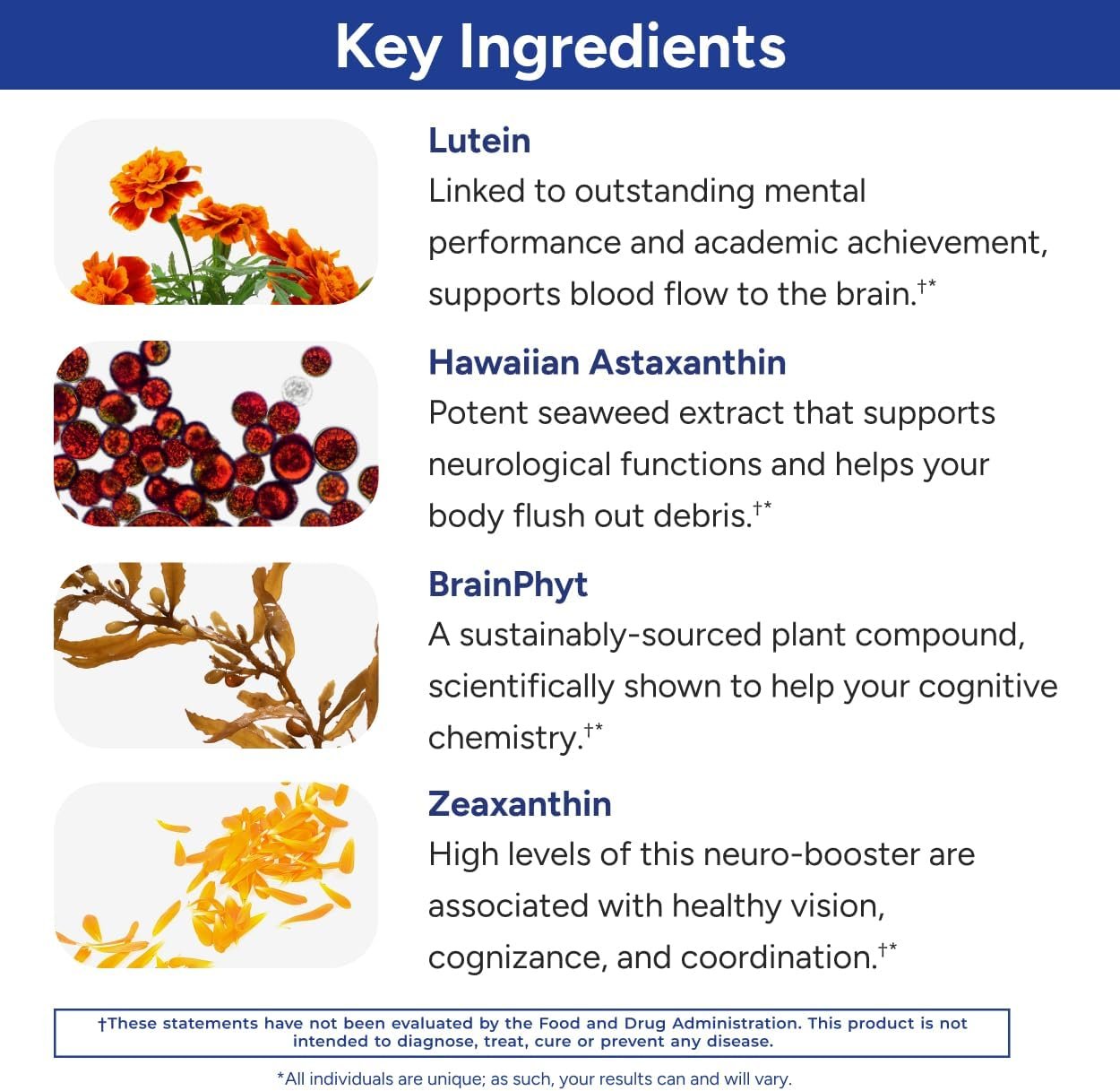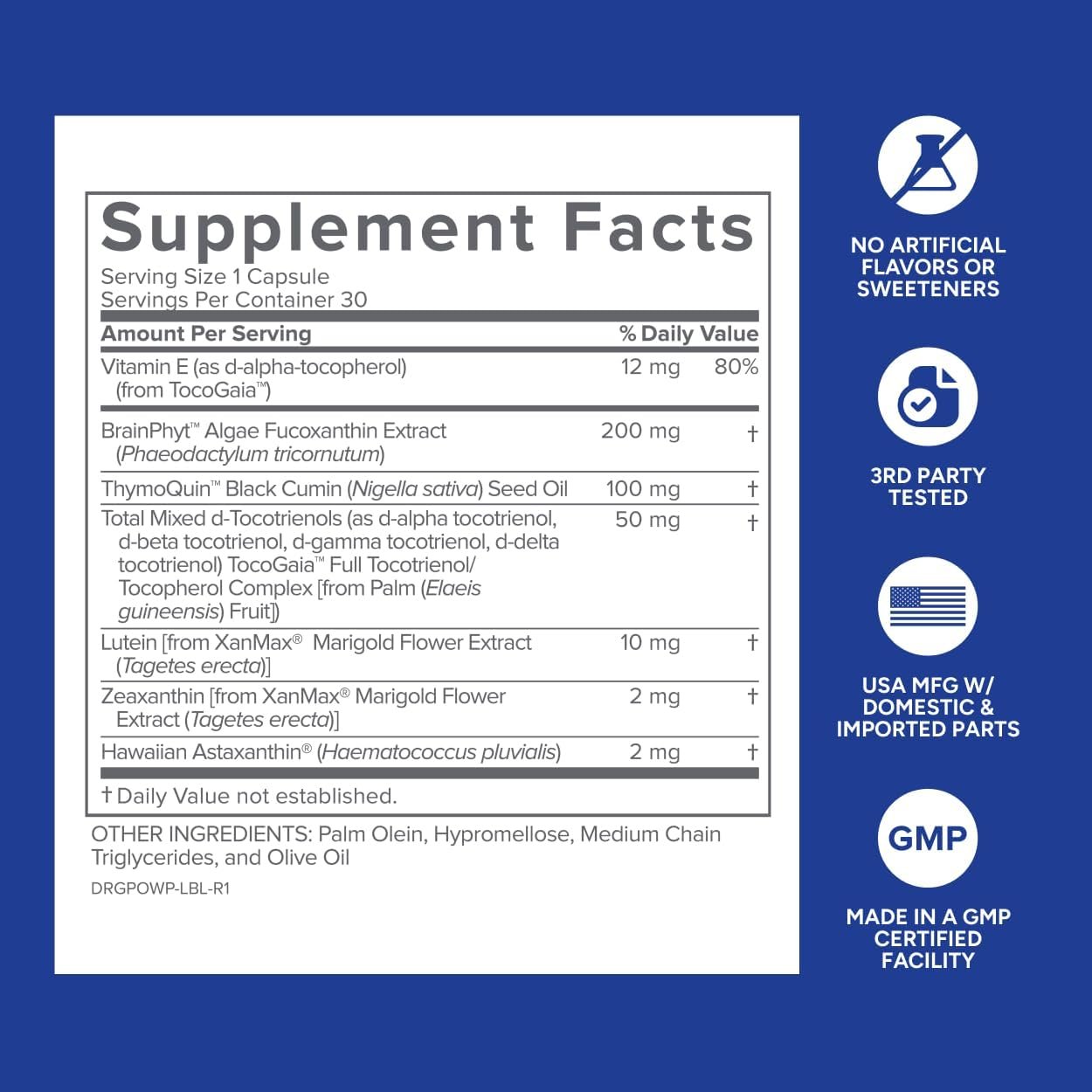 Potent Ingredients: The formula includes BrainPhyt Algae Fucoxanthin, ThymoQuin Black Cumin Seed Oil, Total Mixed d-Tocotrienols/Tocopherols, Lutein, Zeaxanthin, and Hawaiian Astaxanthin. Each ingredient is backed by scientific research to provide elite neuro-supportive abilities.*