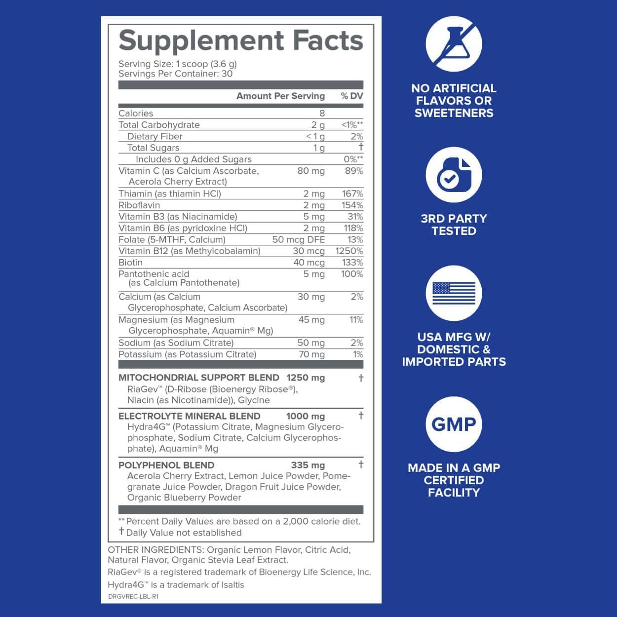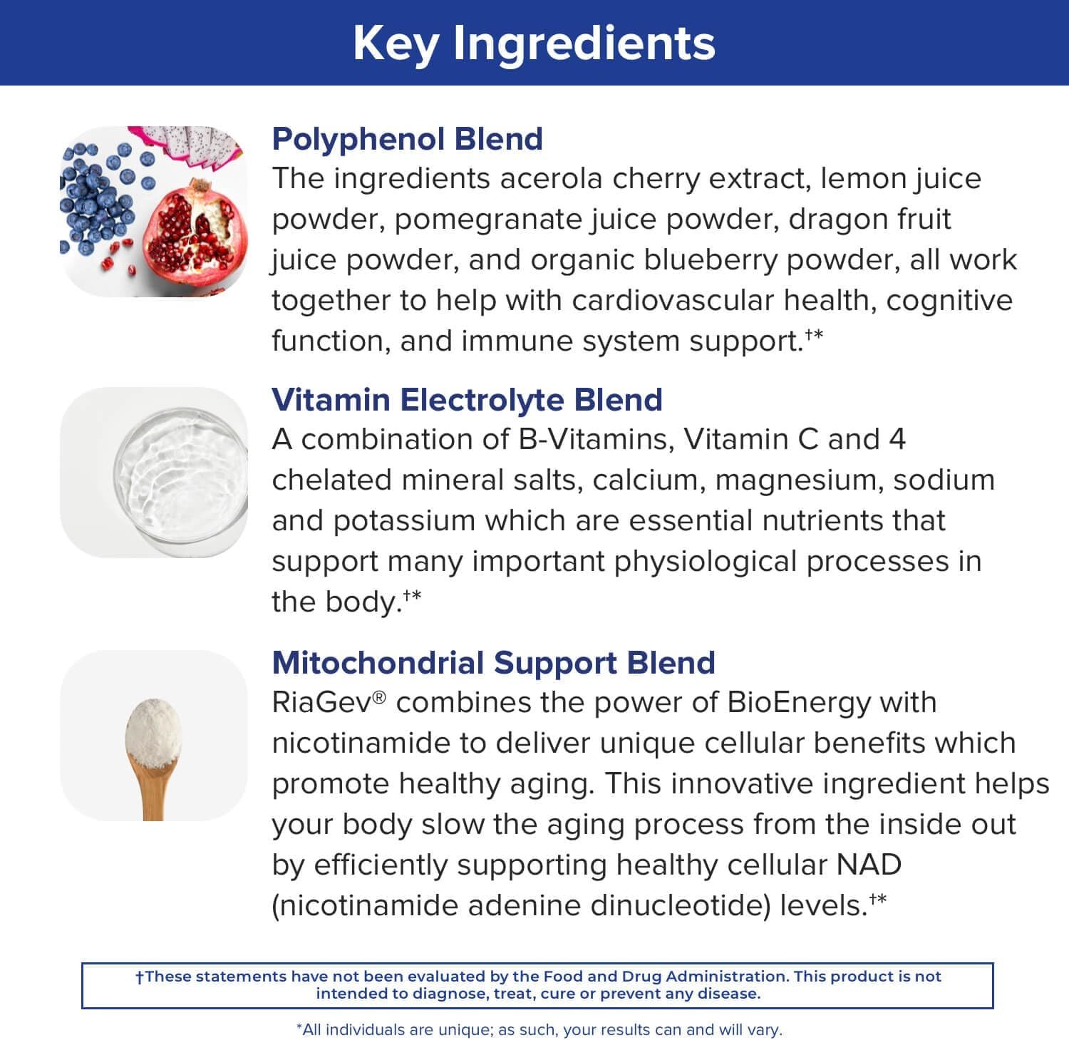 Polyphenol Power: Vital Recharge harnesses the power of polyphenols, which are plant-based compounds known for their potent antioxidant properties. Additionally, polyphenols have been associated with various health benefits, including cardiovascular health, cognitive function, and immune system support.