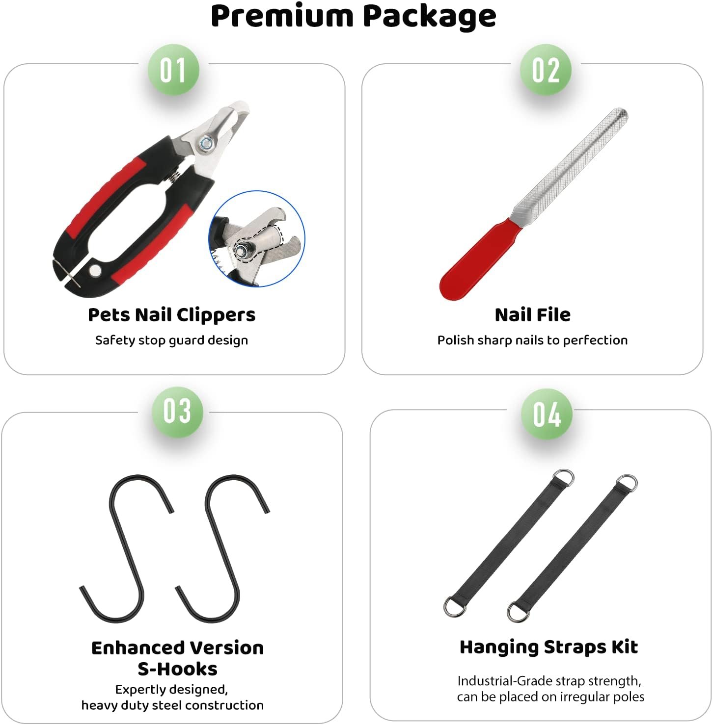 🐕 [ Professional Dog Grooming Kit ]: Safety Sling x 1 (Prevent puppy or kitten from breaking free) Nail clipper x 1(safety stop guard design), Nail file x 1, S-hook x 2 (suitable for the round bar), Hanging Sling x 2(suitable for the irregular bar).