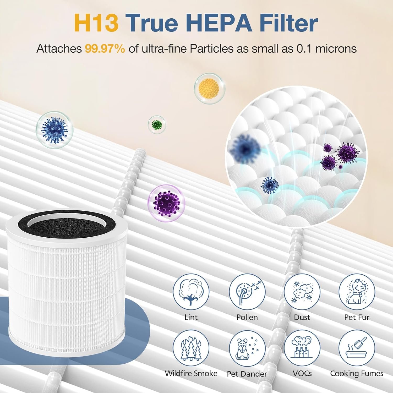 【H13 TURE HEPA FILTER】Featuring H13 grade HEPA Filter, this H7126 air purif-ier filter will effectively attach 99.97% of airborne particles like PM2.5, fine dust, pollen, pet dander and other particles down to 0.1 micron, providing a reliable shield against airborne contaminants for a fresher and more comfortable living space.