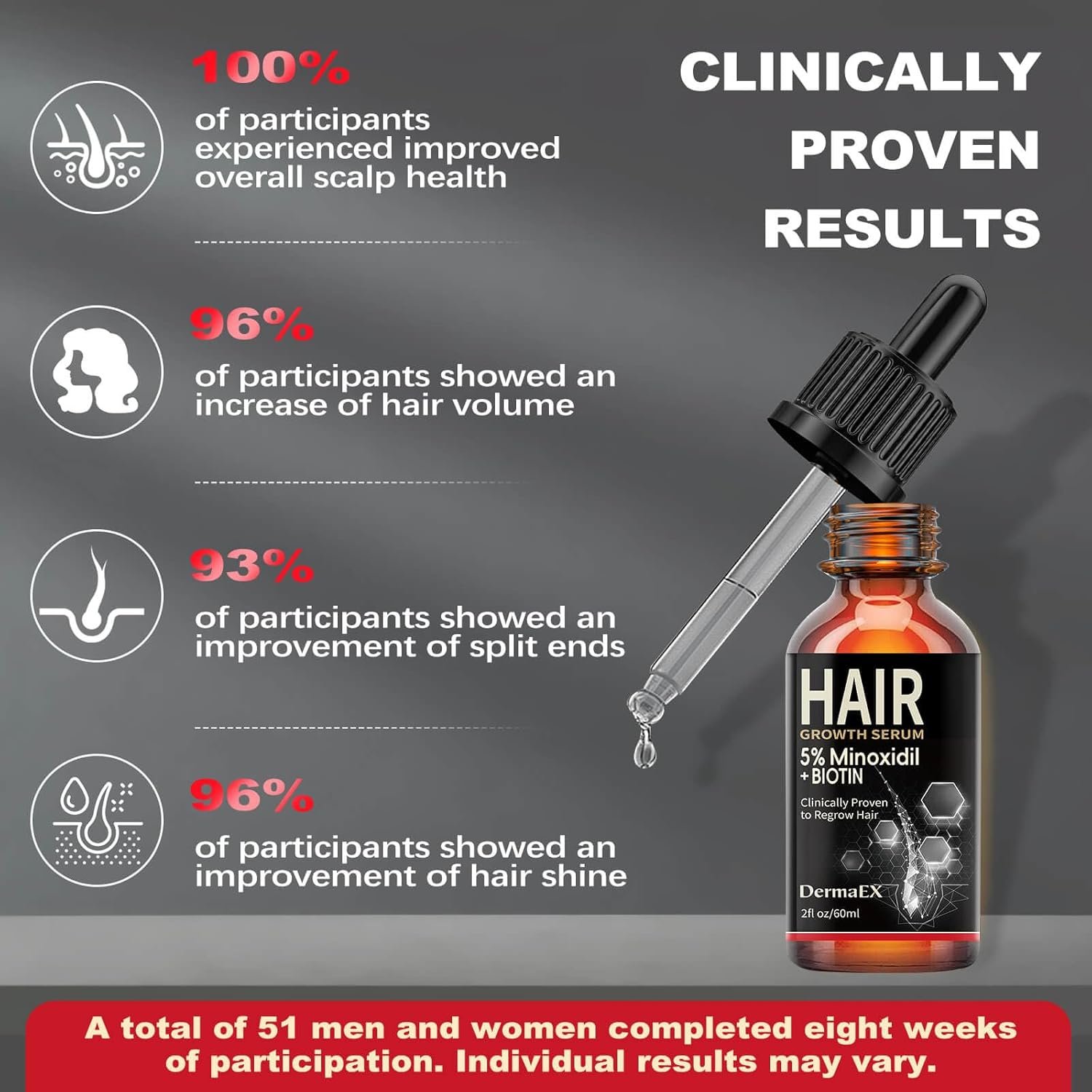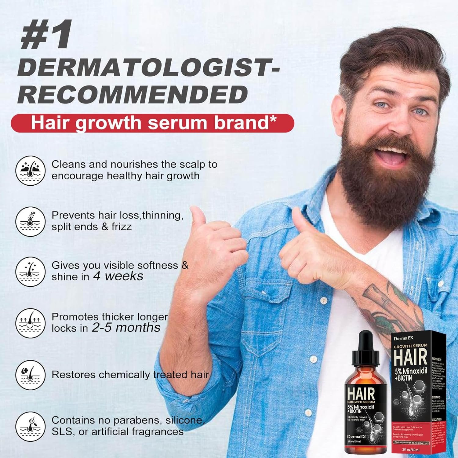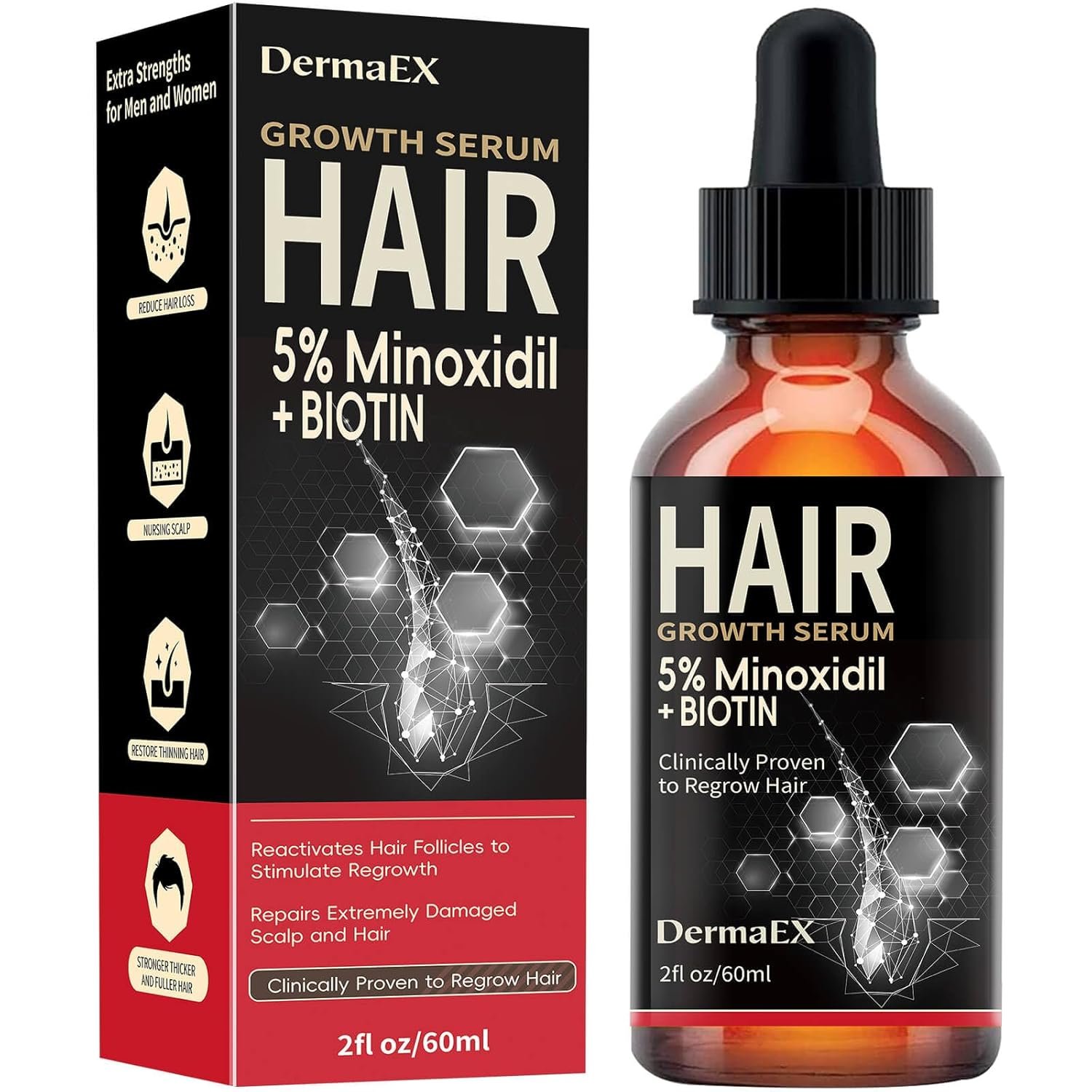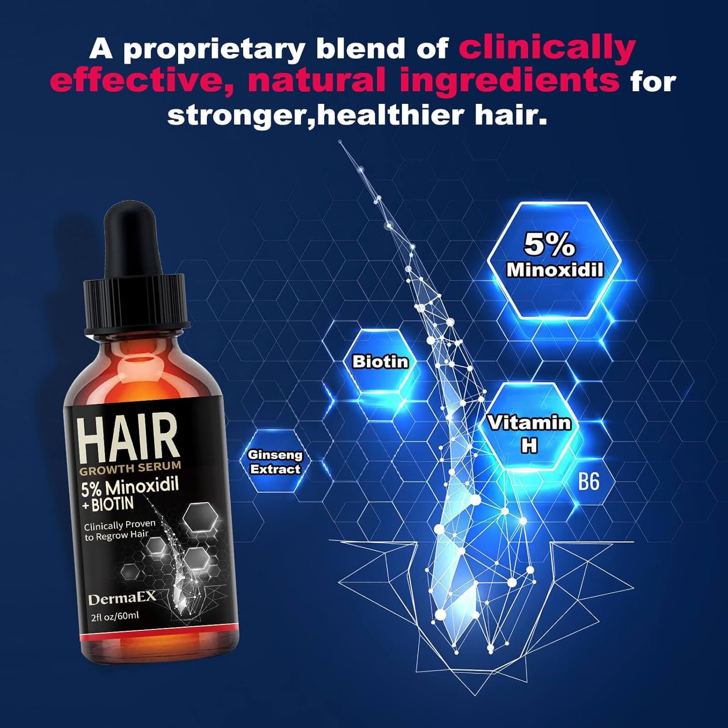 HAIR GROWTH SERUM – 5% Minoxidil & Biotin for Hair Growth for Women & Men strengthen thinning and weak hair resulting in noticeably thicker, fuller, and younger-looking hair. Biotin, a B complex vitamin, helps stimulate hair regrowth, causing hair to thicken and appear healthier while growing more quickly and sustainably.