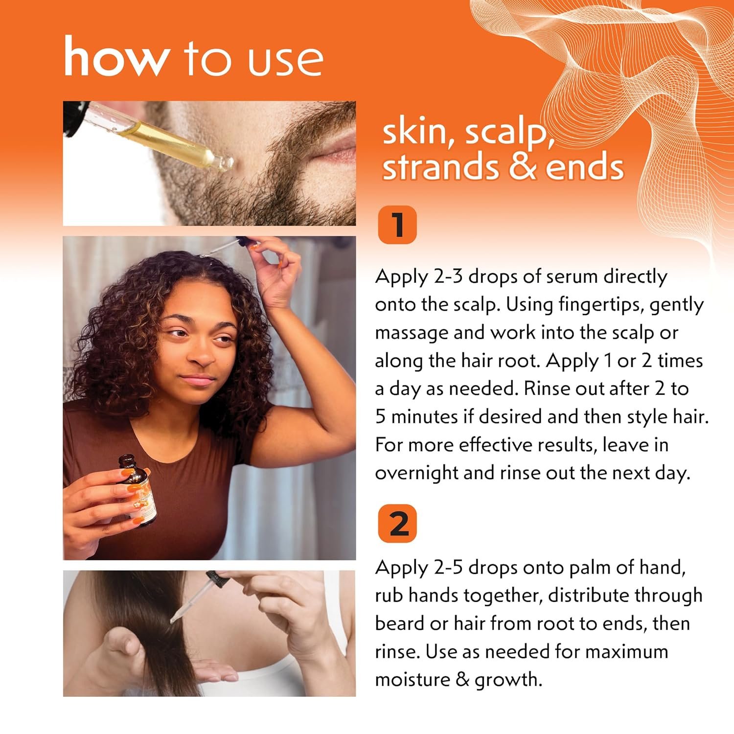Apply 2-3 drops of serum directly onto the scalp. Using fingertips, gently massage and work into the scalp or along the hair root. Apply 1 or 2 times a day as needed for maximum moisture and growth. For more effective results, leave in overnight and rinse out the next day.