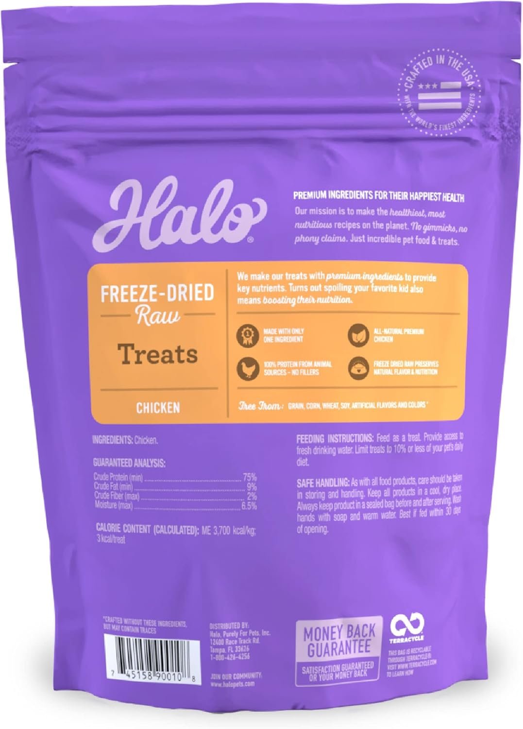 Made with 100% protein from animals: One 2.2-oz pouch of Halo Freeze Dried Treats is packed with freeze dried raw all-natural, premium chicken