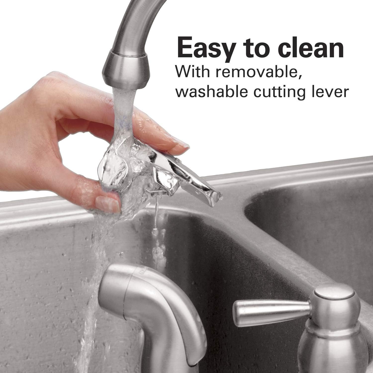 EASY TO CLEAN: The washable cutting lever on the electric can opener easily removes to rinse clean under the faucet.