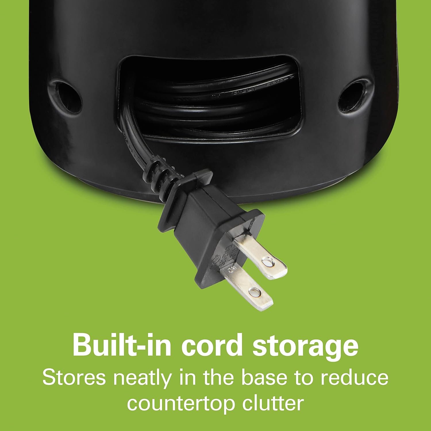 CORD STORAGE: Excess cord stores neatly in the base of the can opener to reduce countertop clutter and for easy storage.