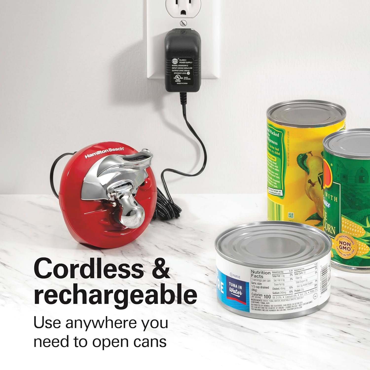 CORDLESS & RECHARGEABLE: Once charged, you can take the Hamilton Beach can opener to the tabletop, camping, or anywhere you need to open cans without worrying about a cord or having an electrical outlet nearby.