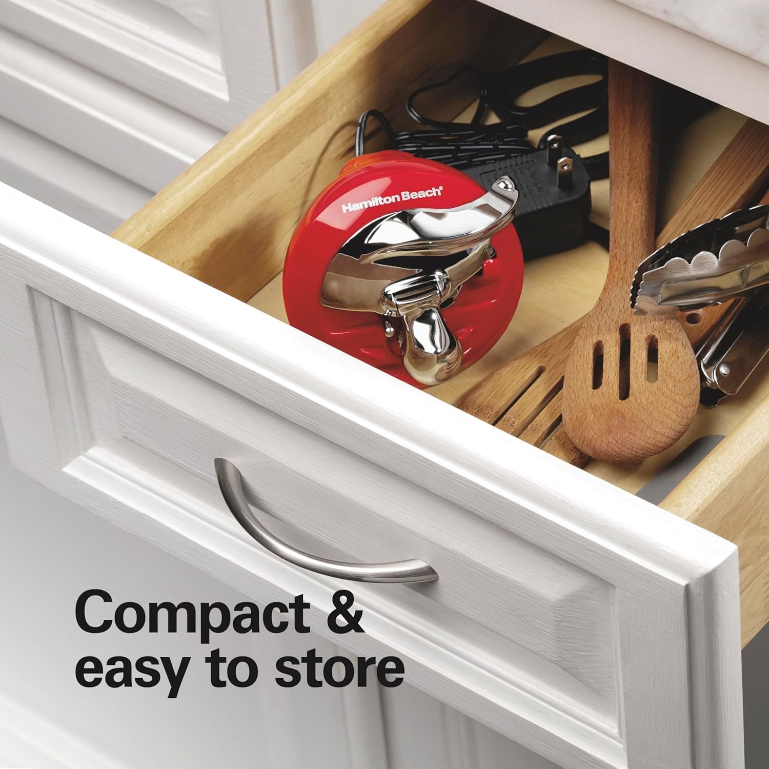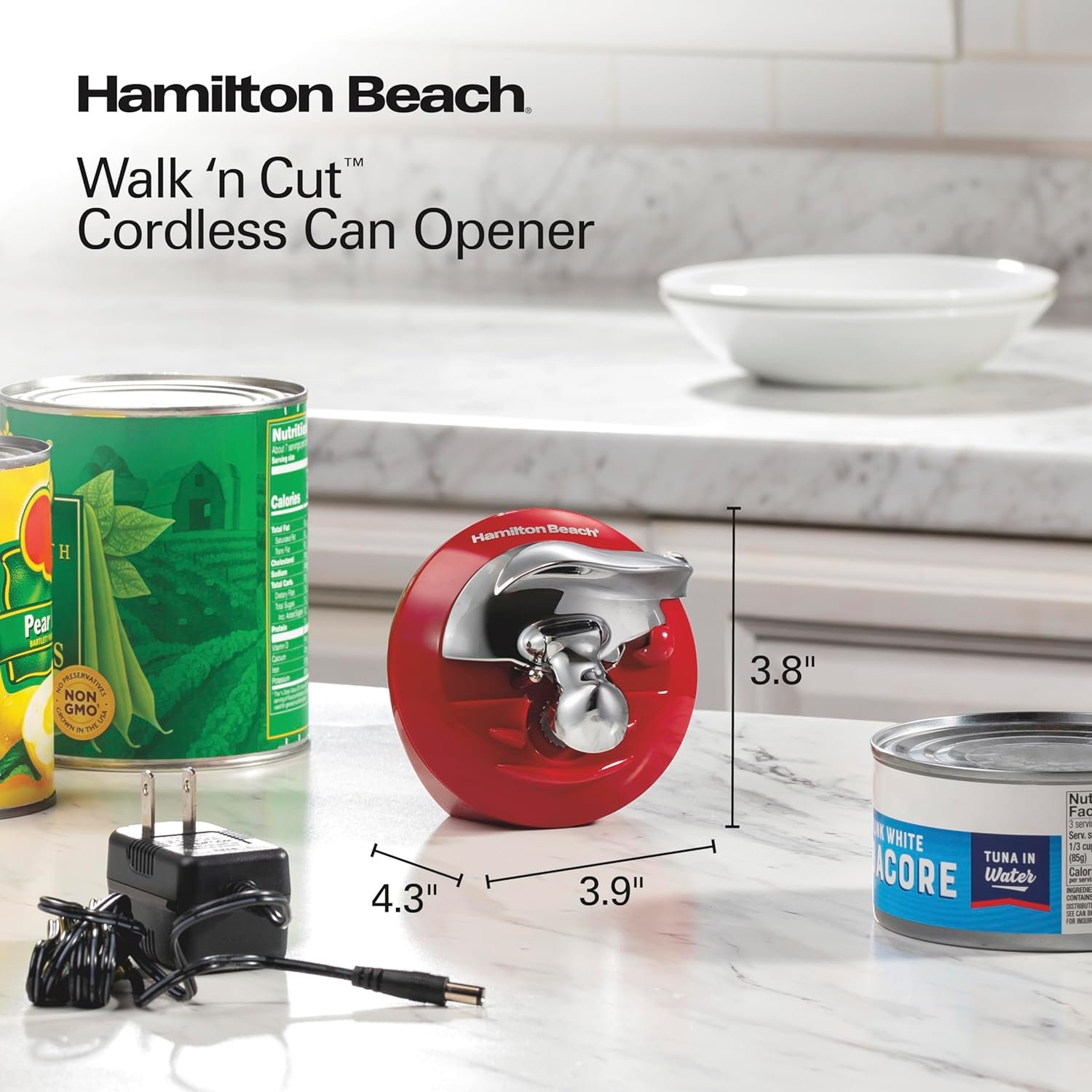 The Hamilton Beach® Walk ‘n Cut™ Can Opener is cordless and rechargeable. It opens cans hands-free by moving itself along the lid while cutting and then automatically shuts off when finished. It’s easy to clean and easily stores in a drawer.