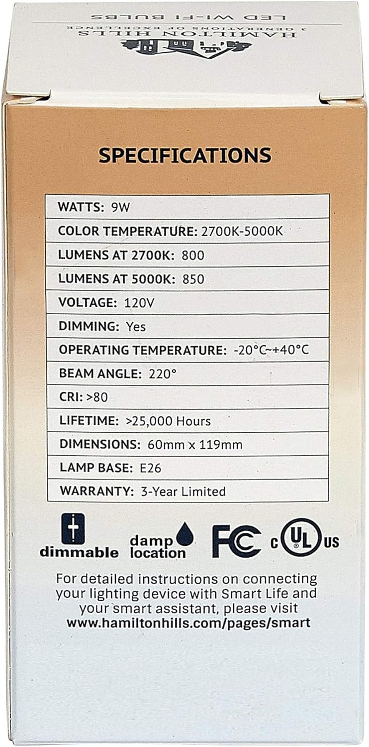 COLOR TUNABLE AND DIMMABLE: Through the use of the Smart Life App you can adjust your color temperature between a warm light yellow 2700K and a cool white 5000K. Damp rated and dimmable brightness. Energy efficient 9W with 850 lumens and rated for over 25,000 lifetime hours with a CRI over 80.