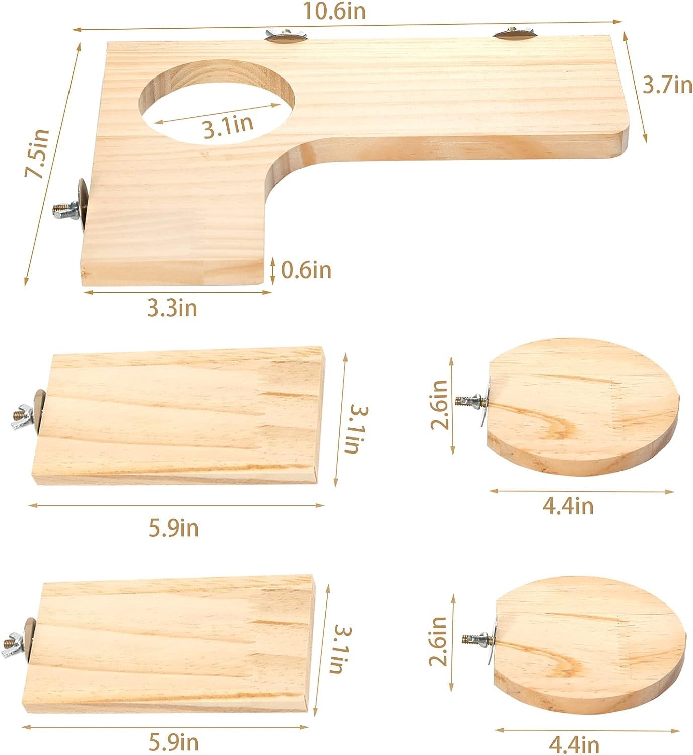 Package: A set of hamster wooden platforms include a L-shaped wooden board, 2 round wooden boards and 2 square wooden board. Different shapes and sizes could meet the hamster’s multiple playing preferences.
