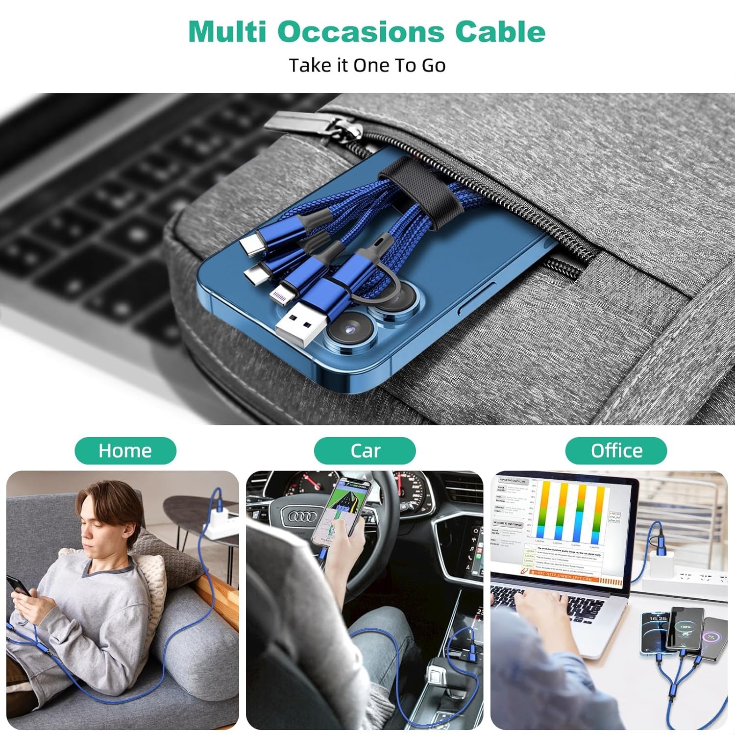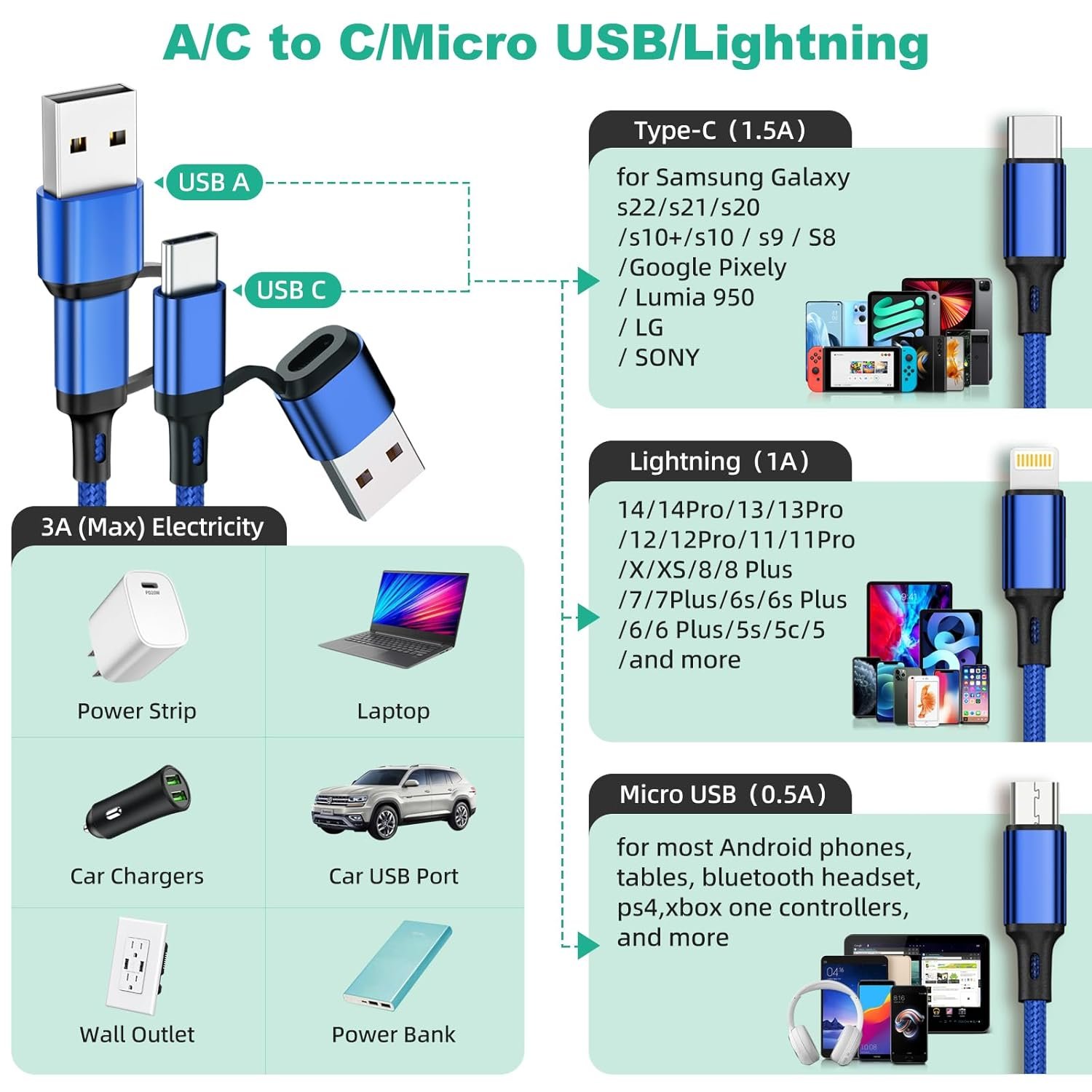 【6 in 1 Multi Charging Cable】6 in 1 USB Multi charging cable, including USB A+C adapters to 3 in 1 Type C/Micro USB/iPhone connectors, can meet your different daily requirements. 4FT Nylon Braided Cord supports to charge most of smart devices on market. (Warm Tips: this multi charging cable only support normal charging speed, and iPhone connectors support 480Mbps transfer data, NOT SUPPORT Apple Car Play)