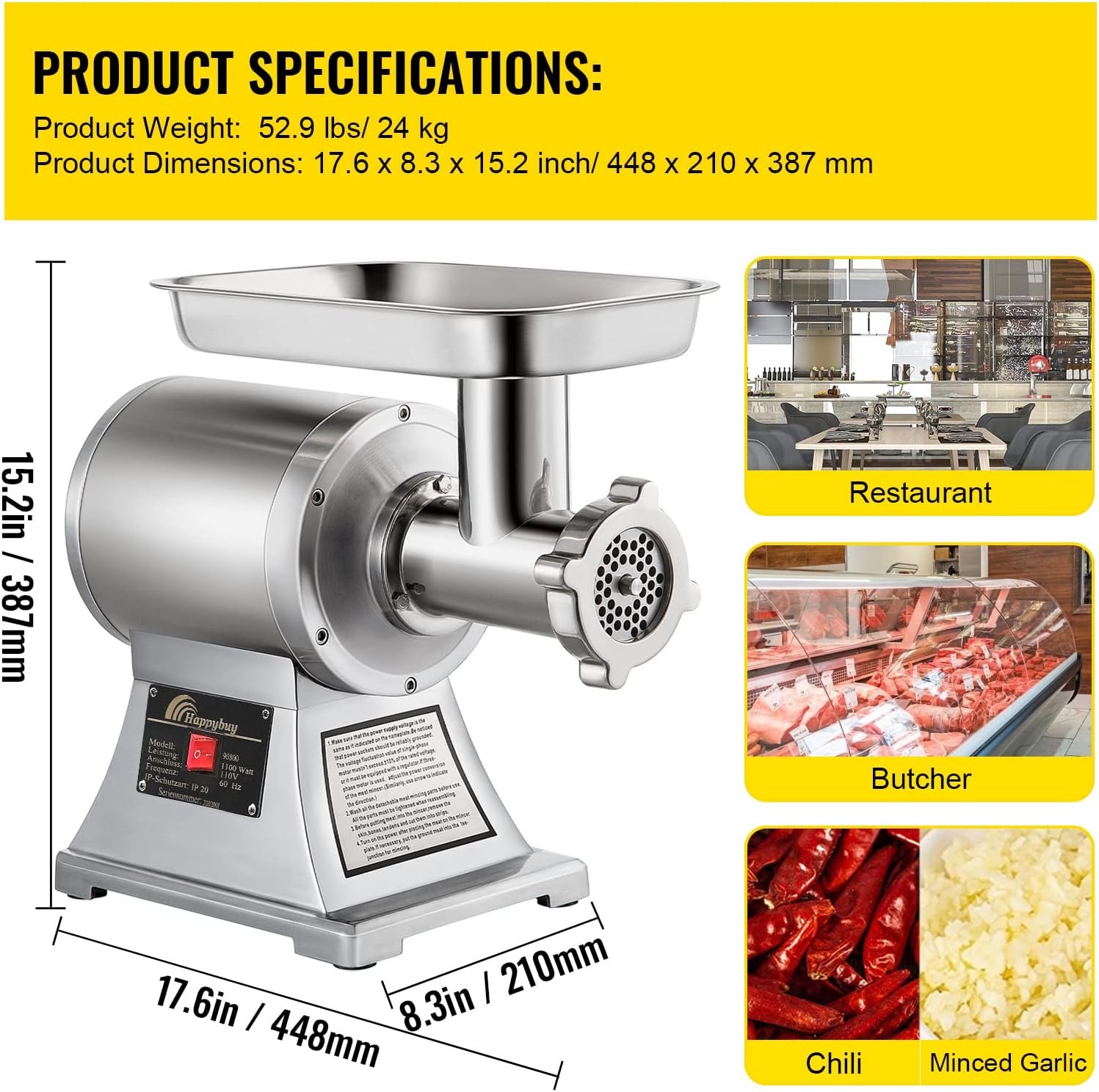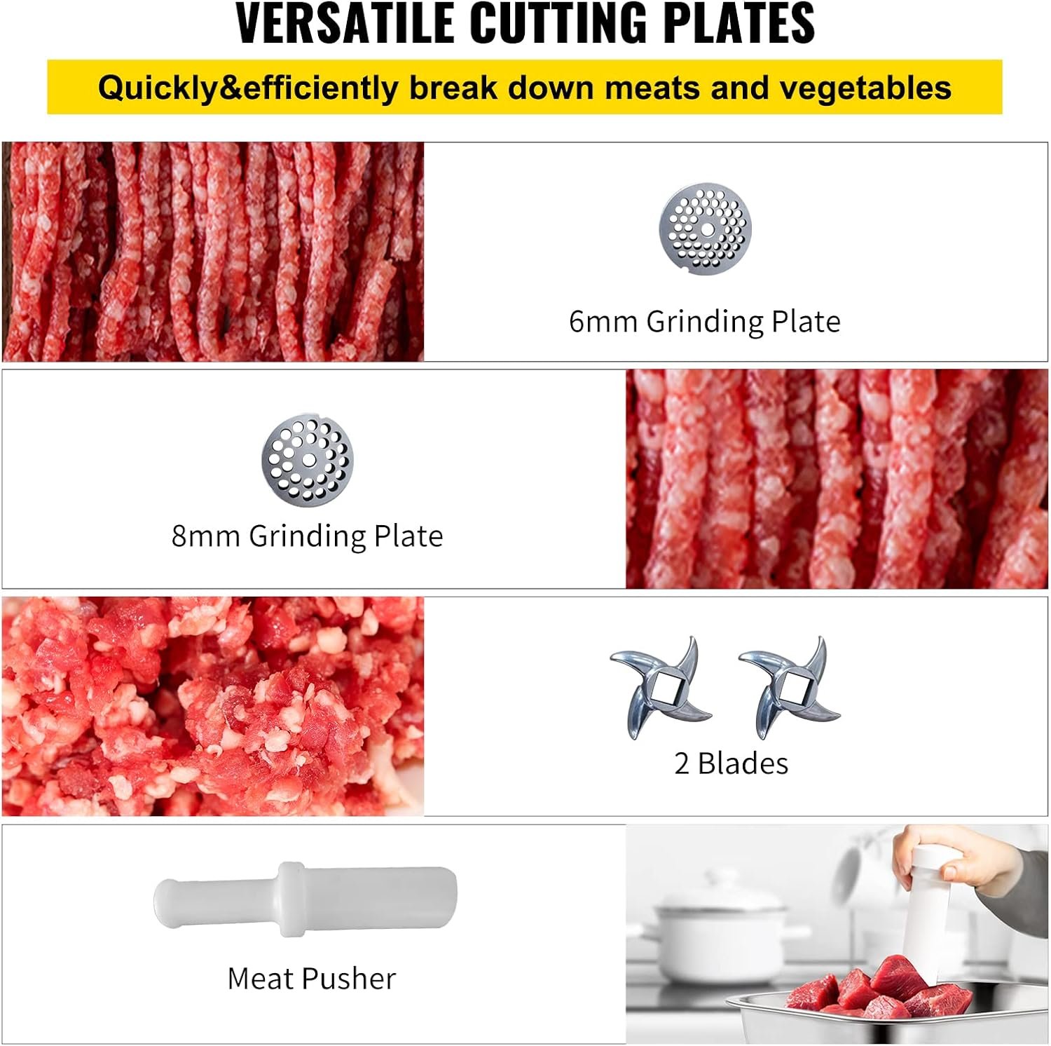 Well-designed Details: A meat pusher is included for convenient meat pushing. 2 grinding plates (6 mm, 8 mm) are also contained. The 6 mm grinding plate is mounted on the machine, and we also offer you a grinding plate in 8 mm for coarse or fine grinding. Voltage: 110V / 60Hz, Speed of blade: 550LB/H, Motor power: 1100W, 150 kg/ 330lbs of meat per hour, 225RPM cutting speed.