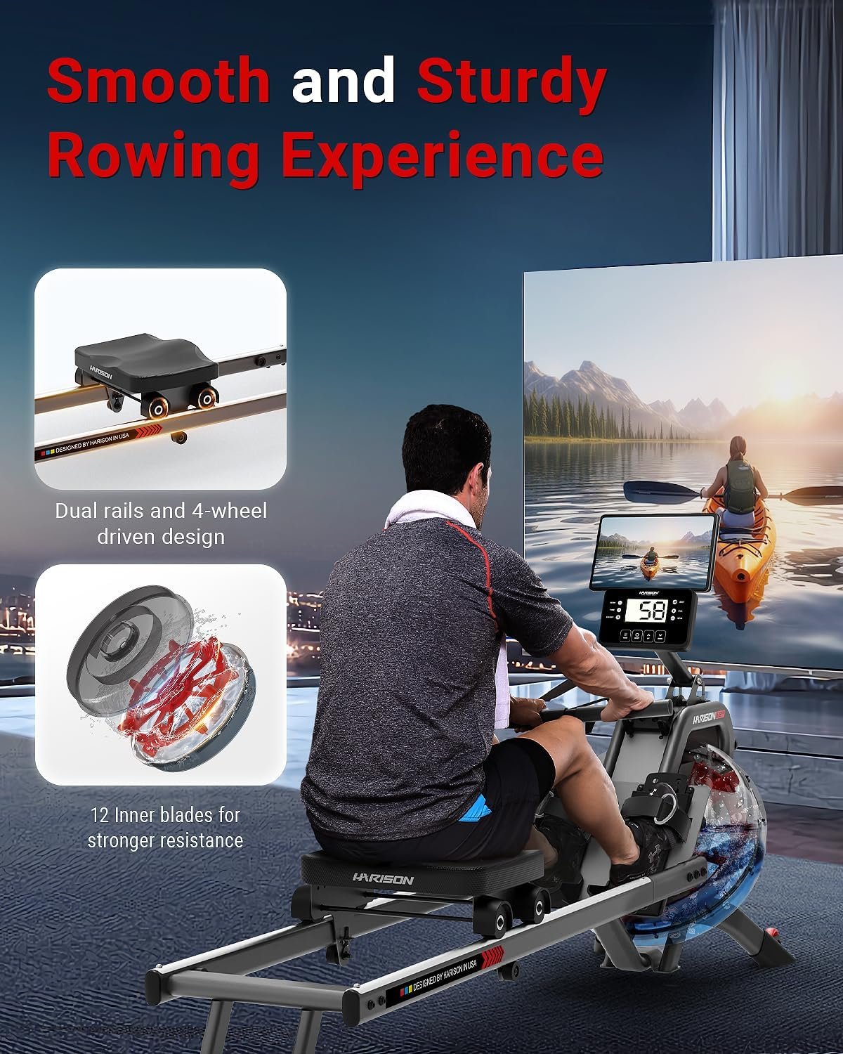 Real Rowing Experience: New Release! – The polycarbonate water tank of this HARISON water rowing machine for home is equipped with twelve blades to provide infinite water resistance, providing stronger resistance to meet your different exercise needs. The water resistance feature allows you to experience a realistic rowing workout at home with every stroke