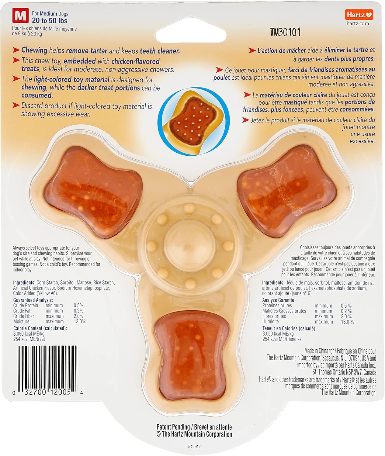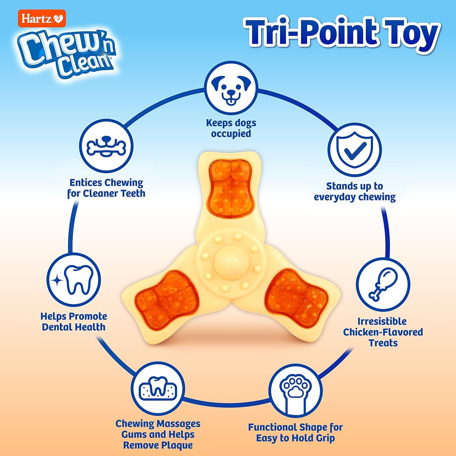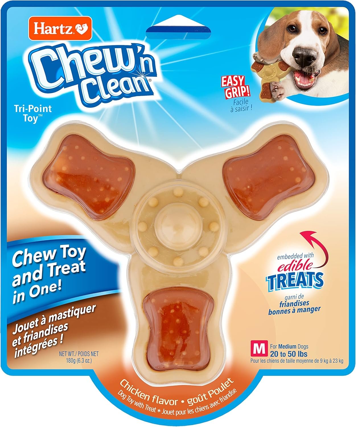 Hartz Chew ‘n Clean Tri-Point dog chew toy and treat in one satisfies your dog’s instinctual and innate desire to chew! The durable nylon exterior is embedded with yummy chicken-flavored treats to pique your dog’s interest and deliver overall chewing satisfaction for moderate chewers. The tough nylon outer shell has shape contours and nubs to gently massage your dog’s gums, remove tartar, and help to keep teeth clean. The best part of this chew toy is the embedded chicken-flavor treats, further motivating your pup to chew, chew, chew! The fun and functional tri-point shape is specifically designed to be easy for dogs to hold with their paws and grasp in their mouth – the easy handling encourages a positive chewing experience. This Tri-Point Chew Toy is available in two sizes: Small for dogs 10 to 20 pounds and Medium for dogs 20 to 50 pounds. Always supervise your pup during play and chew time and select appropriate toys for both your dog’s size and chewing habits.