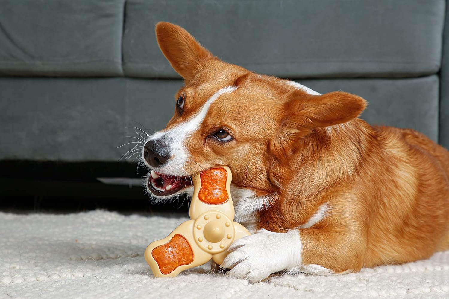 The toy’s outer shell has nubs and contours that gently massage your dog’s gums and help to clean teeth by keeping tartar and plaque at bay, along with freshening breath.