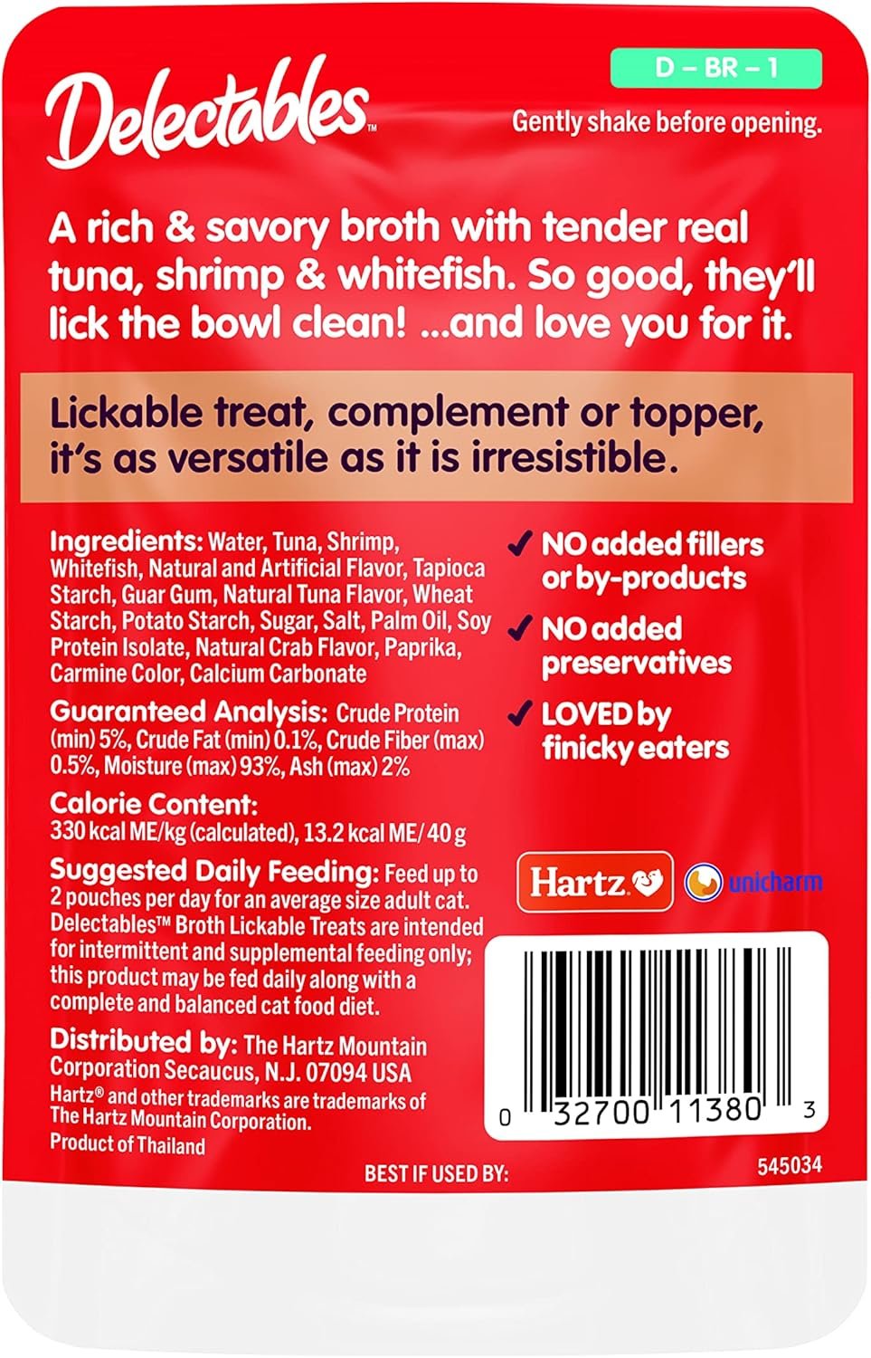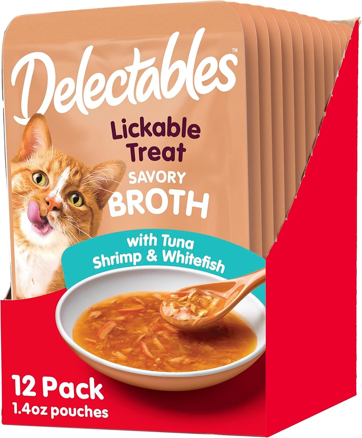 Sold as “Hartz Delectables Savory Broths Lickable Treat for Cats – Tuna, Shrimp & Whitefish, 1.4 Ounce (Pack of 12)” i.e. 12 Pack