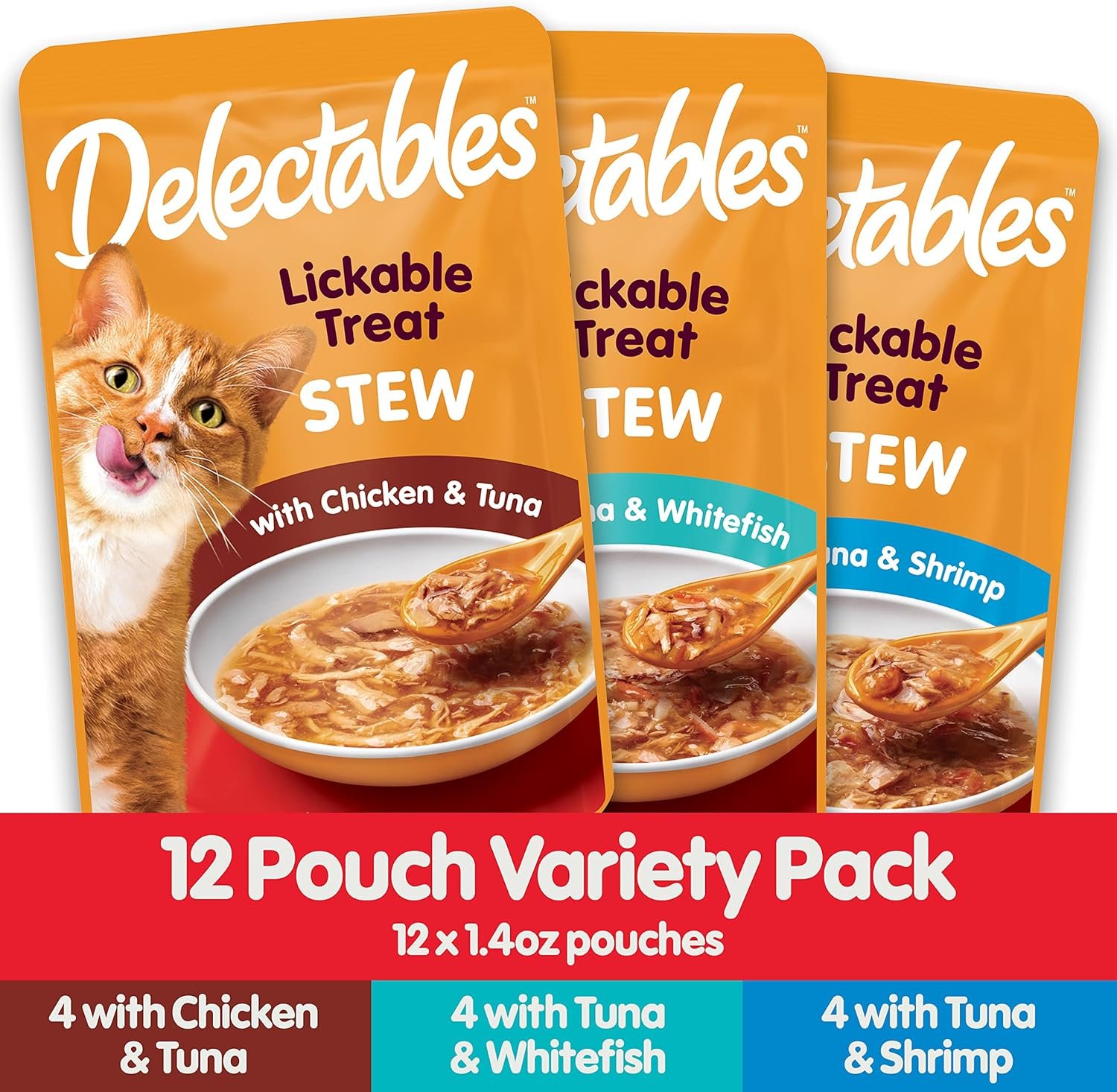 CONTAINS: This pack of Delectables Stew contains twelve (12) 1.4-ounce lickable cat treats.