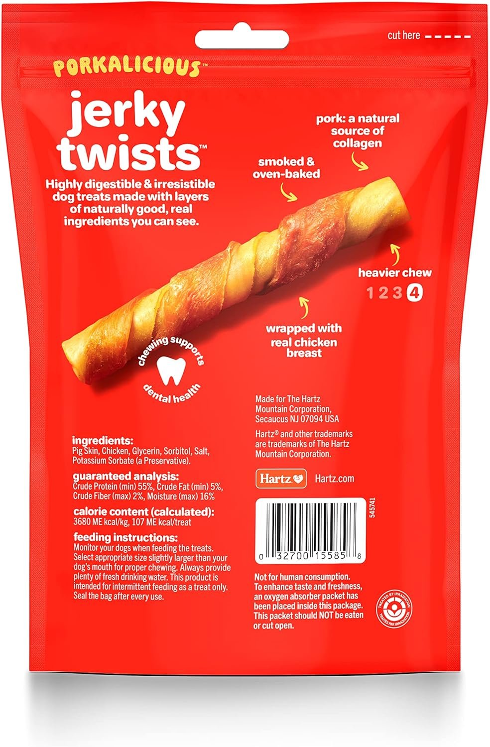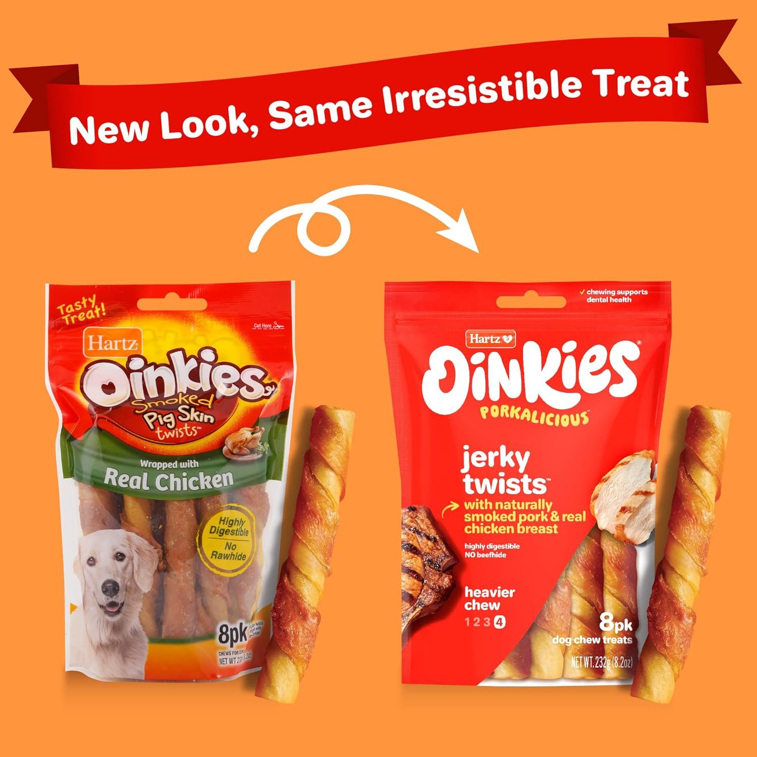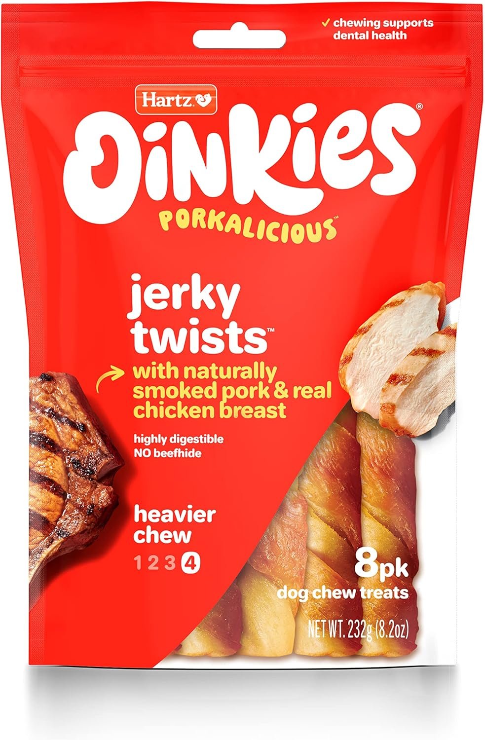 Hartz Oinkies Jerky Twists are highly digestible and irresistible dog treats made with layers of naturally good, real ingredients you can see. Without any beef rawhide, these Oinkies dog treats are made with real pigskin and wrapped with real chicken breast so they are full of flavor! These dog chew treats are smoked and oven-baked to lock in that delicious flavor your dog will go crazy for! Oinkies Jerky Twists are considered a heavier chew.