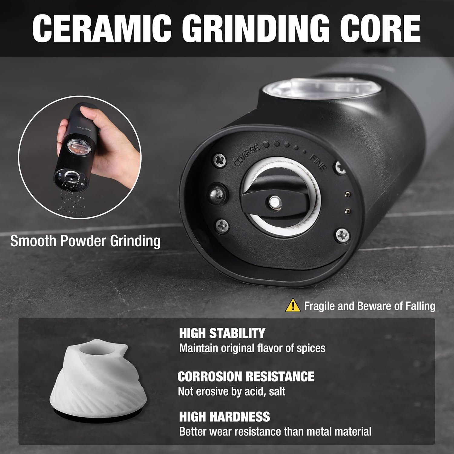 The upgraded rustproof ceramic core has higher stability, which helps spices maintain original flavor, and you can simply turn the adjustment knob to achieve your desired level of fineness