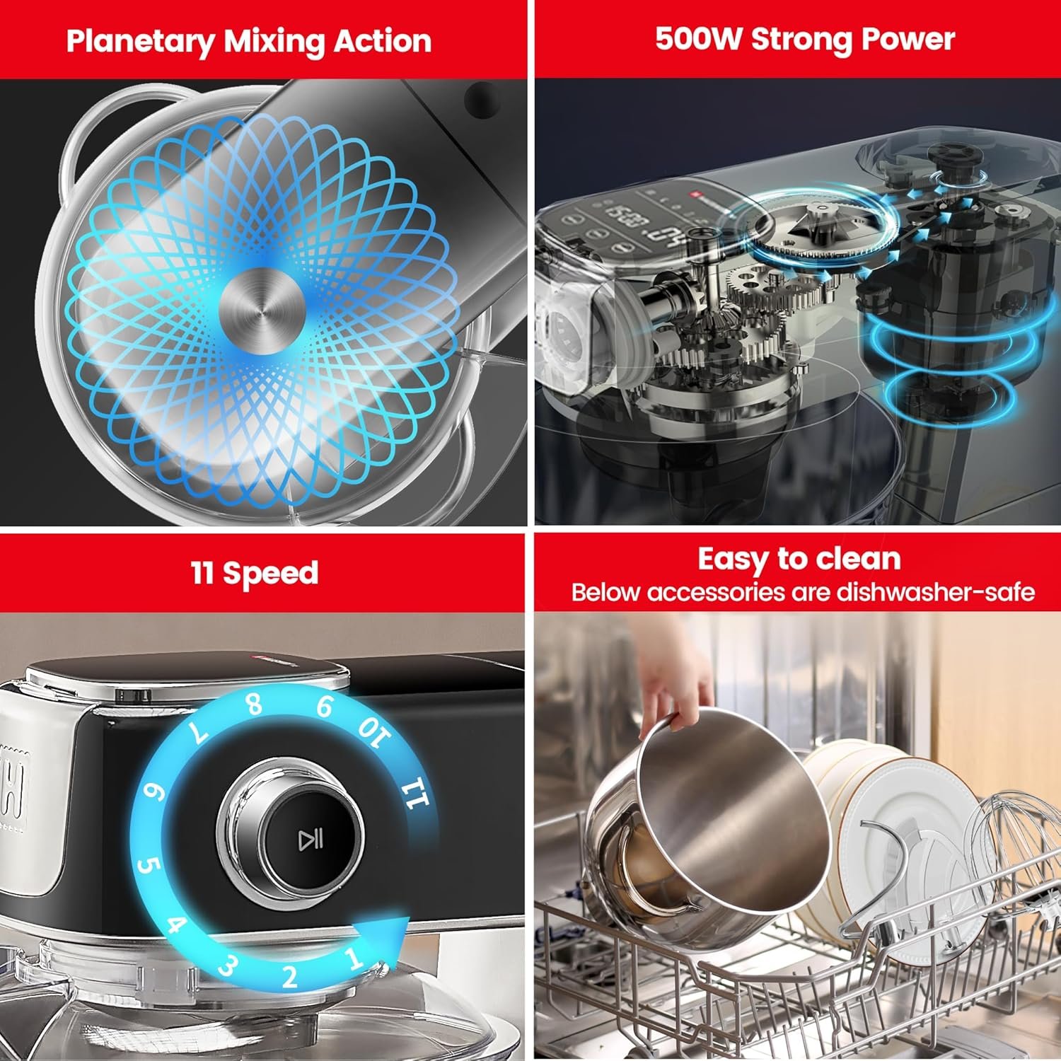 đă3 IN 1 Accessories Dishwasher SafeăOur kitchen mixer features upgraded stainless steel, 3-in-1 accessories including the Egg Whisk, Dough Hook, and Flat Beater for easy installation and durability. All of the attachments for the mixers for baking are dishwasher-safe for quick and easy cleaning.The electric mixer with modern design look, not only work well but also look well.