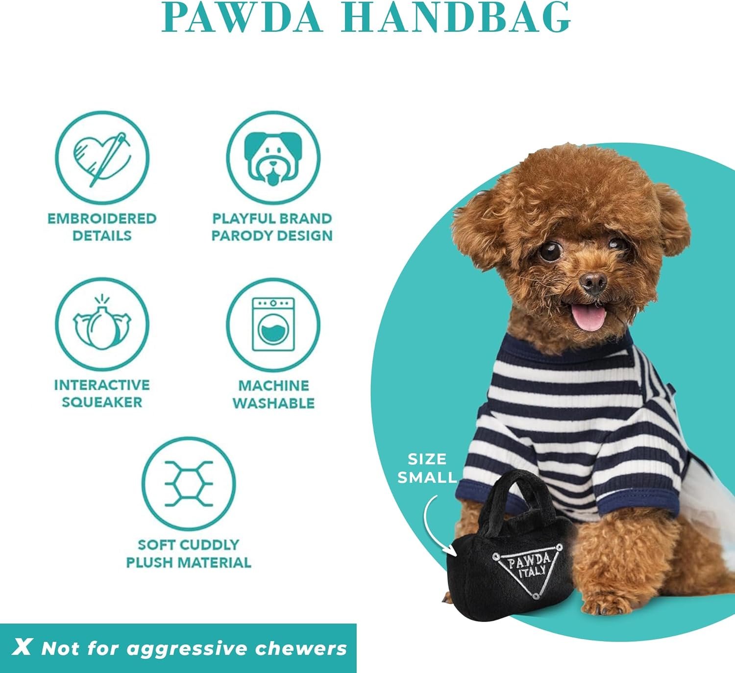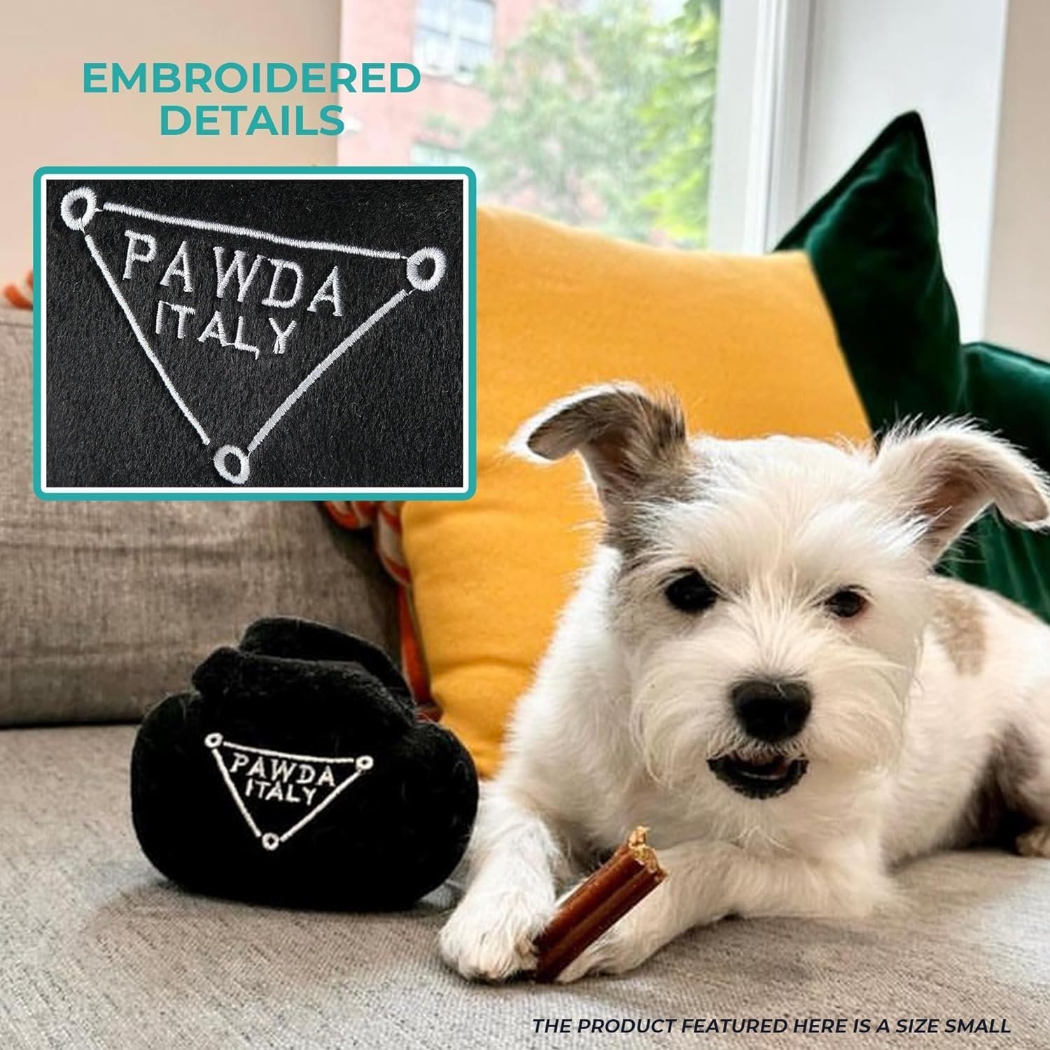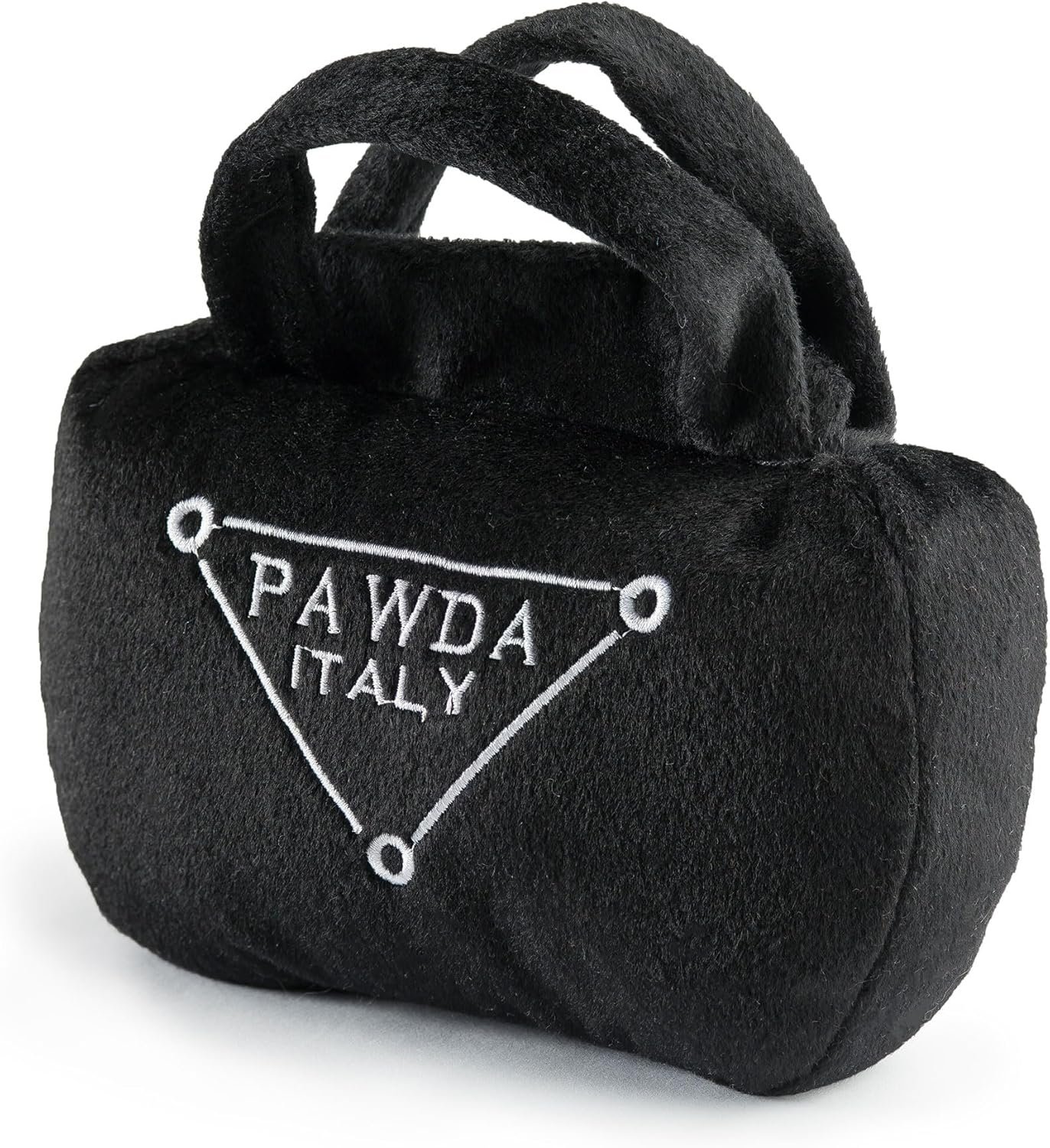 Funny Parody Plush Dog Toy: Let your furry fashionista fetch or strut some fashion-forward fun with this Pawda Handbag dog toy that features a black velvety exterior and a built-in squeaker hidden inside. Embroidered details read ”Pawda Italy”. It’s a playful, cute interactive dog toy that combines style & fun. Size Small 3″x5.5”x1.5”.