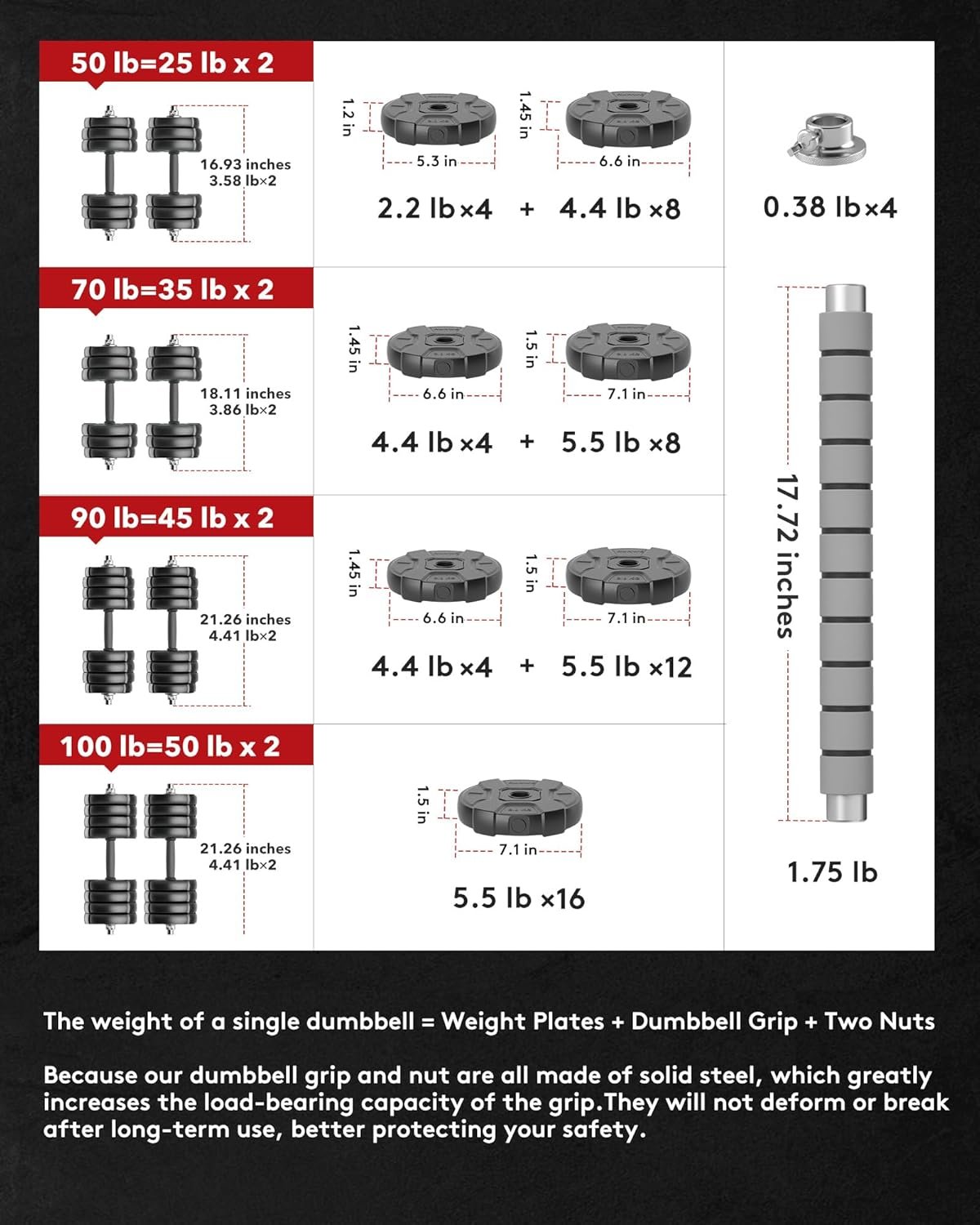 ADJUSTABLE WEIGHT SETS 2-IN-1 DUMBBELL BARBELL DESIGN: RUNWE adjustable dumbbells set comes with a connecting bar that can be easily attached to both dumbbells to transform into a barbell. There are also adjustable weight plates that let you customize the weight of the dumbbell/barbell to your desired setting. This allows you to efficiently use our dumbbell/barbell set for many exercises instead of buying multiple sets.